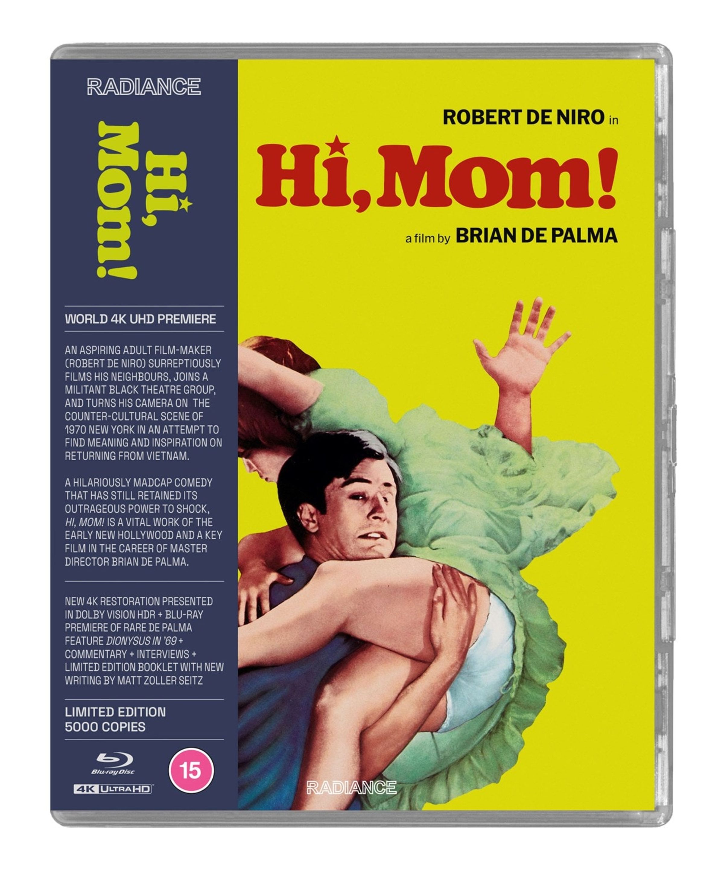 Aspiring adult film-maker Jon Rubin (Robert De Niro, Taxi Driver) returns from a tour of Vietnam and, armed with his film camera, attempts to find meaning and inspiration in the counter-culture of New York in 1970. Rubin graduates from surreptitiously filming his neighbours, to joining a militant Black experimental theatre group, before flirting with full-scale domestic terrorism, in this hilariously madcap satire that has still retained its outrageous power to shock, fifty years after initially stunning American audiences. Making its world premiere on 4K UHD, Hi, Mom! is a vital work of the early New Hollywood, and a key work in the career of master director Brian De Palma.