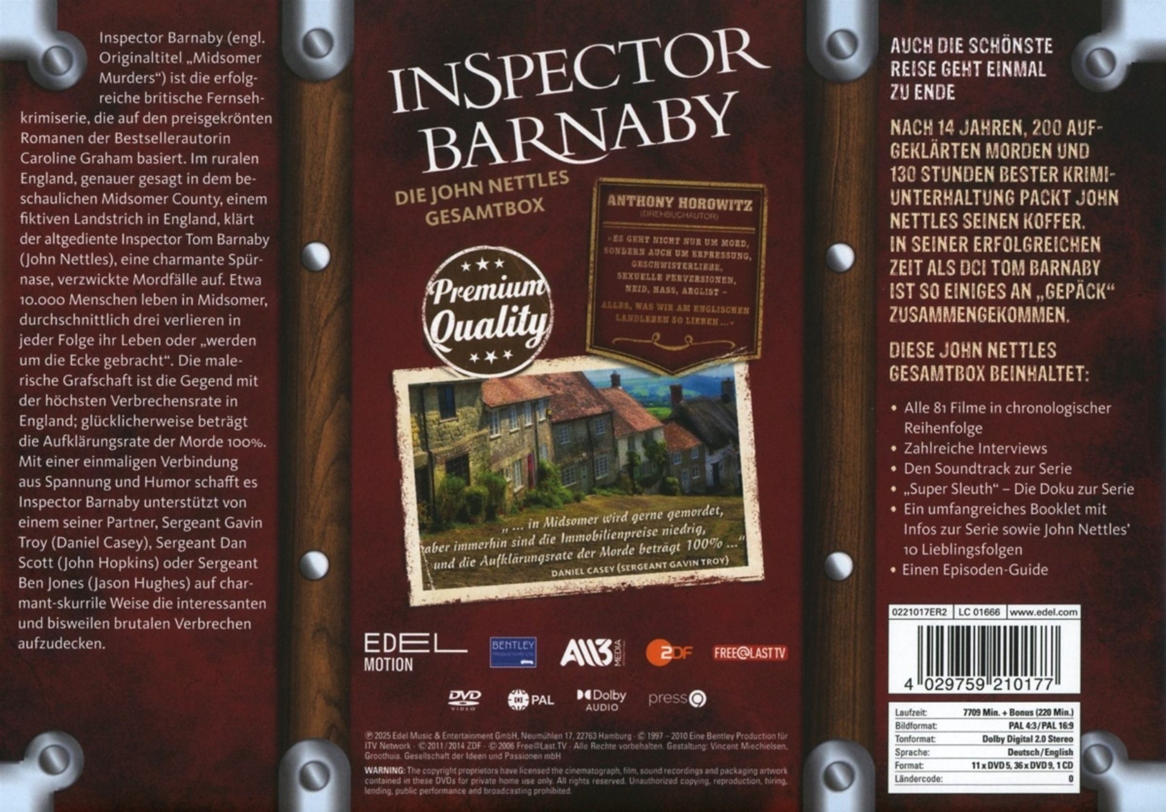 Nach 14 Jahren, 200 aufgeklärten Morden und 130 Stunden bester Krimi-Unterhaltung packt John Nettles seinen Koffer. In seiner erfolgreichen Zeit als DCI Tom Barnaby ist so einiges an »Gepäck« zusammengekommen. Diese Gesamtbox beinhaltet: