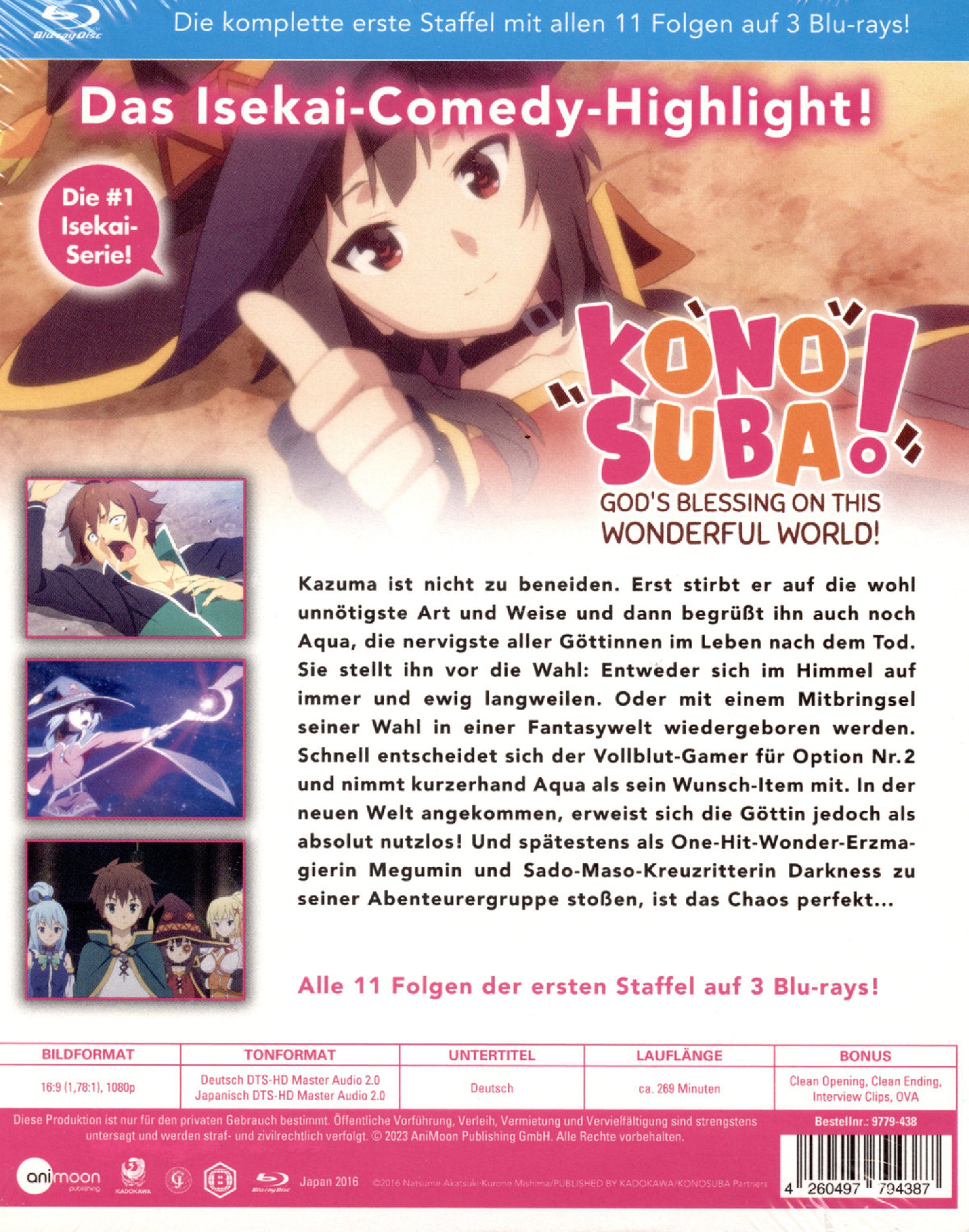 Wie viel Pech kann man eigentlich haben? Erst stirbt Kazuma auf die wohl unnötigste Art und Weise und dann begrüßt ihn auch noch Aqua, die nervigste aller Göttinnen im Leben nach dem Tod. Jetzt hat er zwei Optionen: 1.) Sich im Himmel ewig zu langweilen. Oder 2.) Mit einem Item seiner Wahl in einer echten Fantasywelt, in der es den Dämonenkönig zu töten gilt wiedergeboren zu werden. Schnell entscheidet sich der Vollblut-Gamer für die zweite Option und nimmt Aqua als sein »Wunsch-Item« mit. Jedoch erweist sich die Göttin als absolut nutzlos! Und überhaupt läuft in dieser Welt einfach absolut nichts nach Plan...