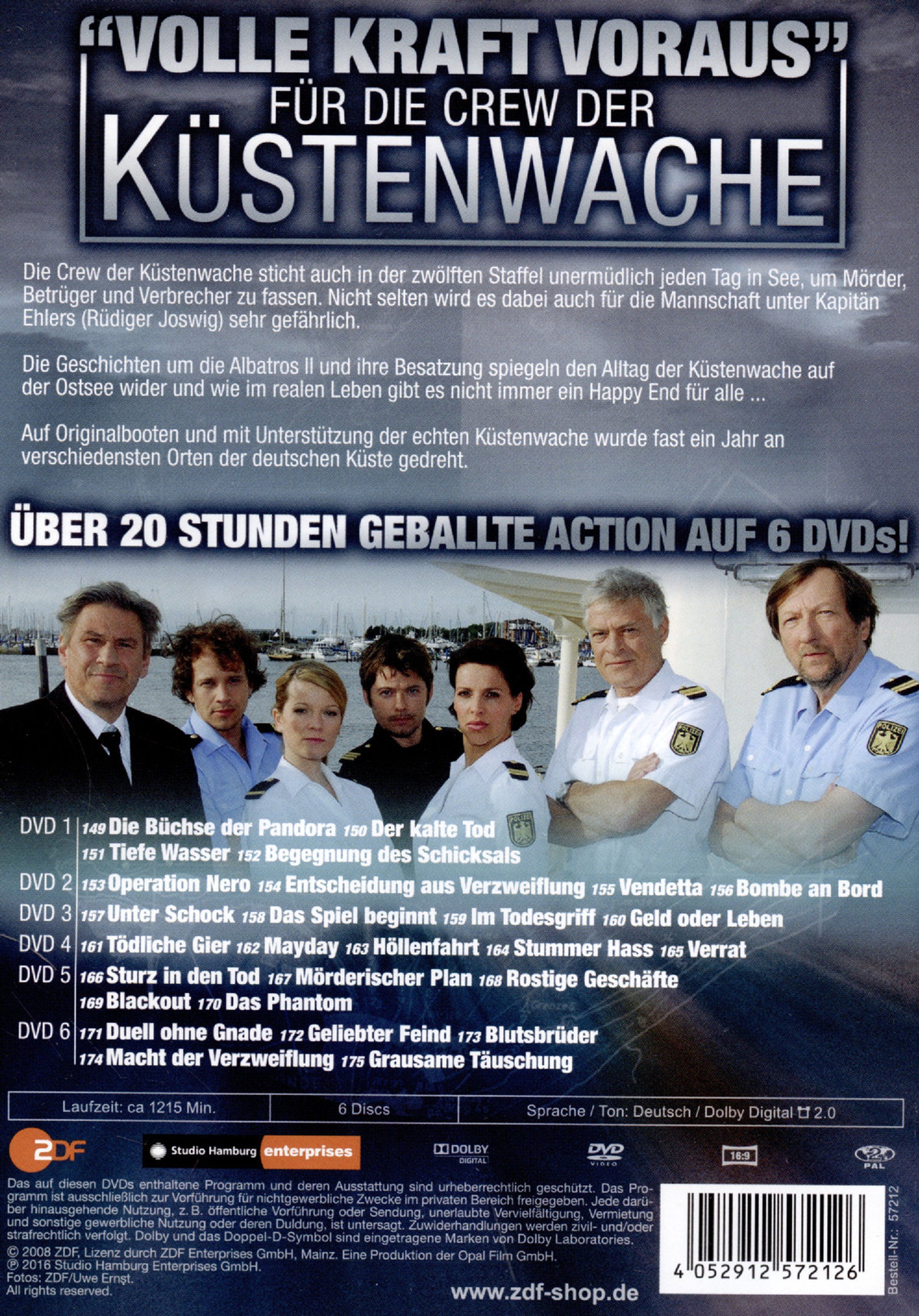 Die Crew der Küstenwache sticht auch in der zwölften Staffel unermüdlich jeden Tag in See, um Mörder, Betrüger und Verbrecher zu fassen. Nicht selten wird es dabei auch für die Mannschaft unter Kapitän Ehlers (Rüdiger Joswig) sehr gefährlich.