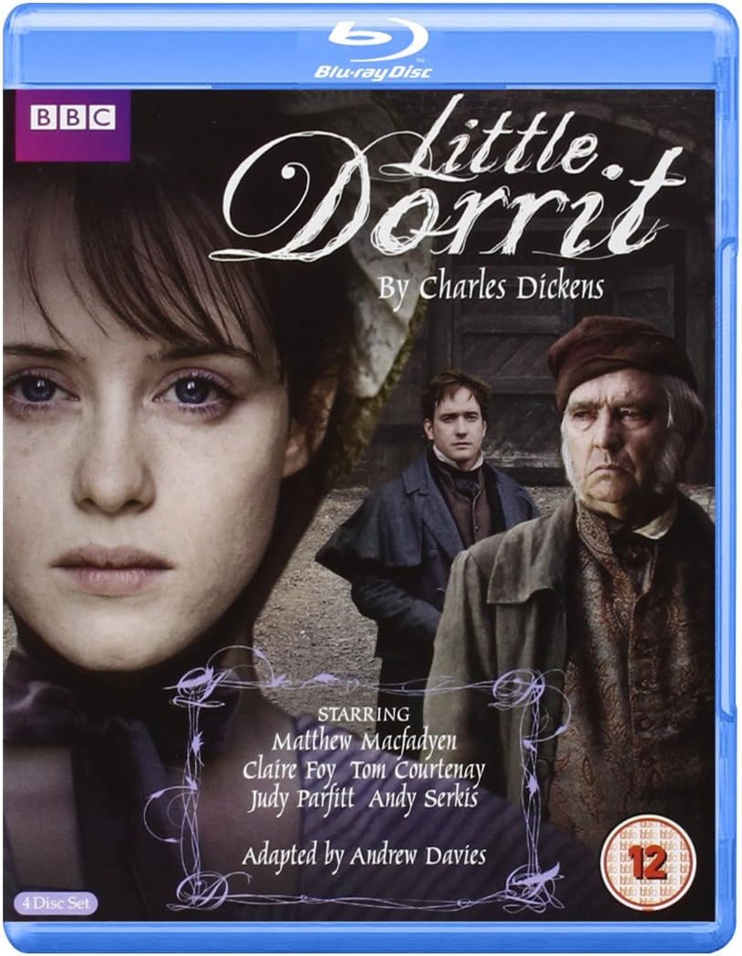"Little Dorrit" von Charles Dickens. Gesichter von zwei Männern und einer Frau im viktorianischen Stil. BBC-Logo oben., 4 Blu-ray Discs