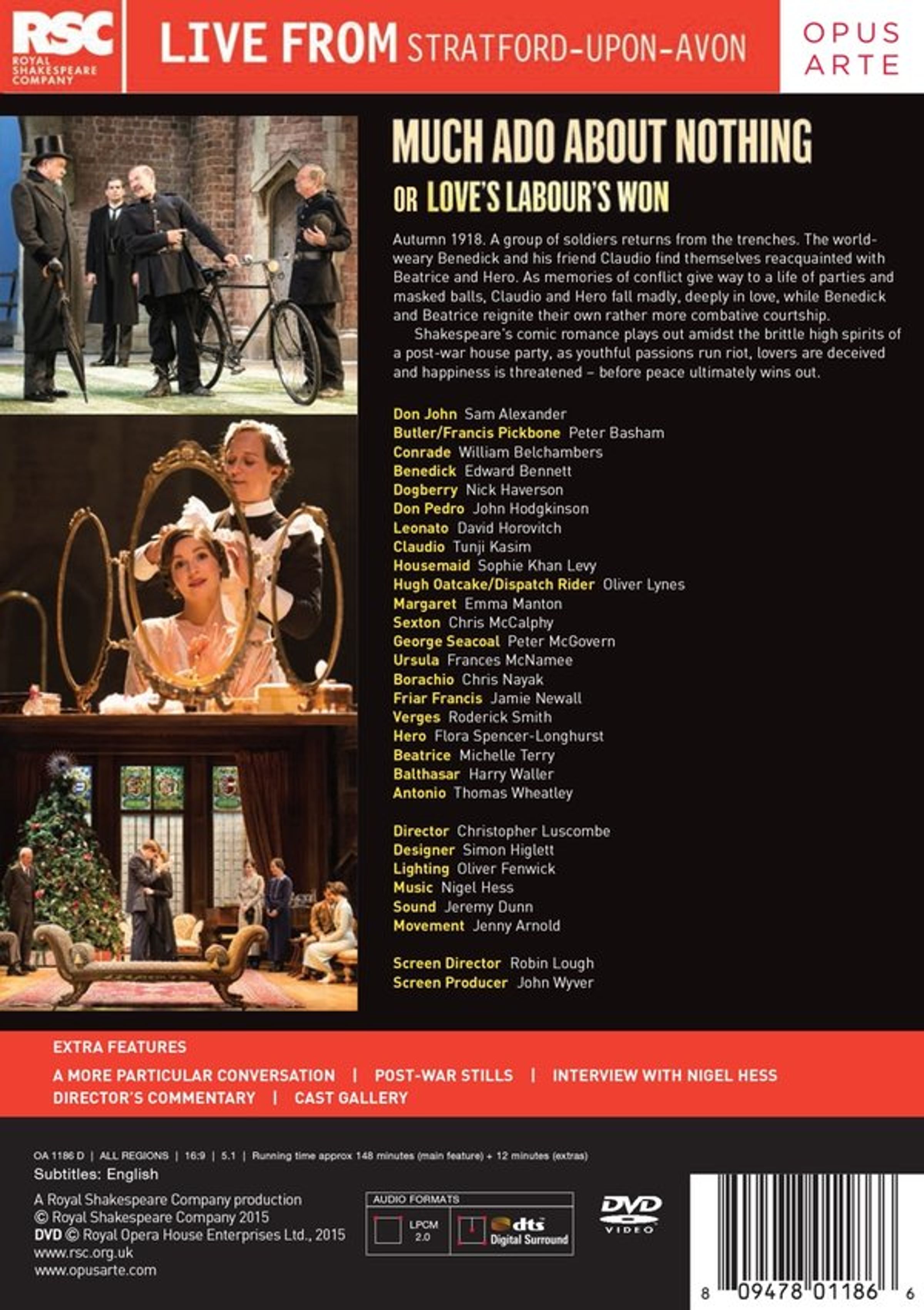 Autumn 1918. A group of soldiers returns from the trenches. The world weary Benedick and his friend Claudio find themselves reacquainted with Beatrice and Hero. As memories of conflict give way to a life of parties and masked balls, Claudio and Hero fall madly, deeply in love, while Benedick and Beatrice reignite their own rather more combative courtship. Shakespeare's comic romance plays out amidst the brittle high spirits of a post-war house party, as youthful passions run riot, lovers are deceived and happiness is threatened – before peace ultimately wins out.