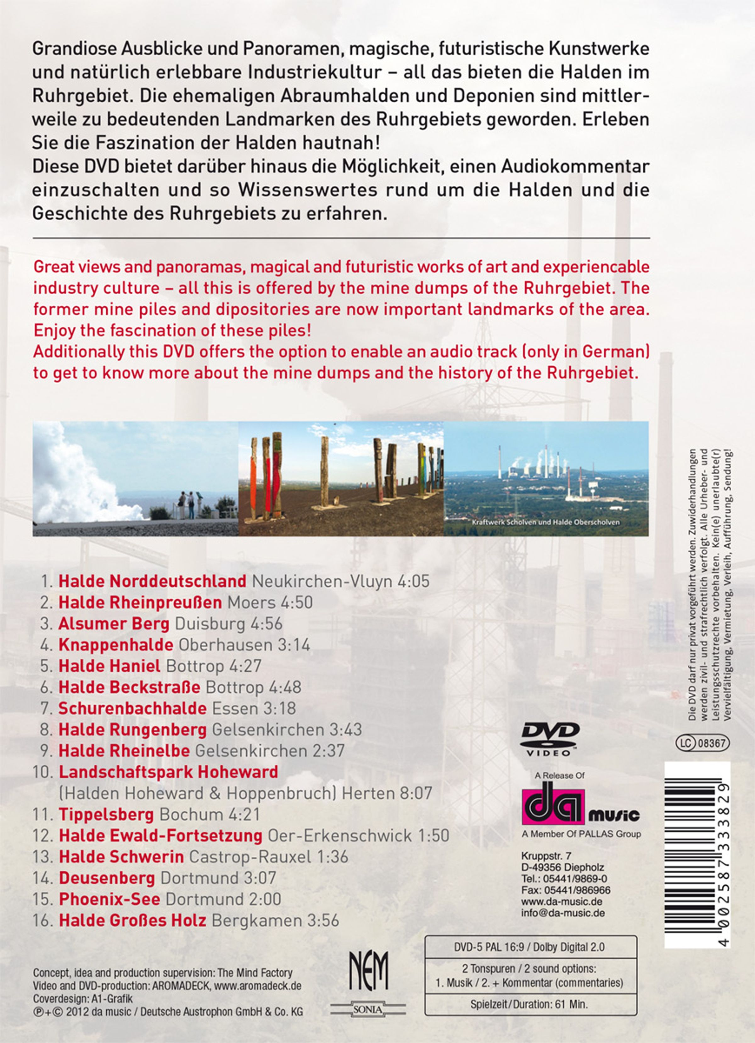 Grandiose Ausblicke und Panoramen, magische, futuristische Kunstwerke und natürlich erlebbare Industriekultur all das bieten die Halden im Ruhrgebiet. Die ehemaligen Abraumhalden und Deponien sind mittlerweile zu bedeutenden Landmarken des Ruhrgebiets geworden. Erleben Sie die Faszination der Halden hautnah! Diese DVD bietet darüber hinaus die Möglichkeit, einen Audiokommentar einzuschalten und so Wissenswertes rund um die Halden und die Geschichte des Ruhrgebiets zu erfahren.