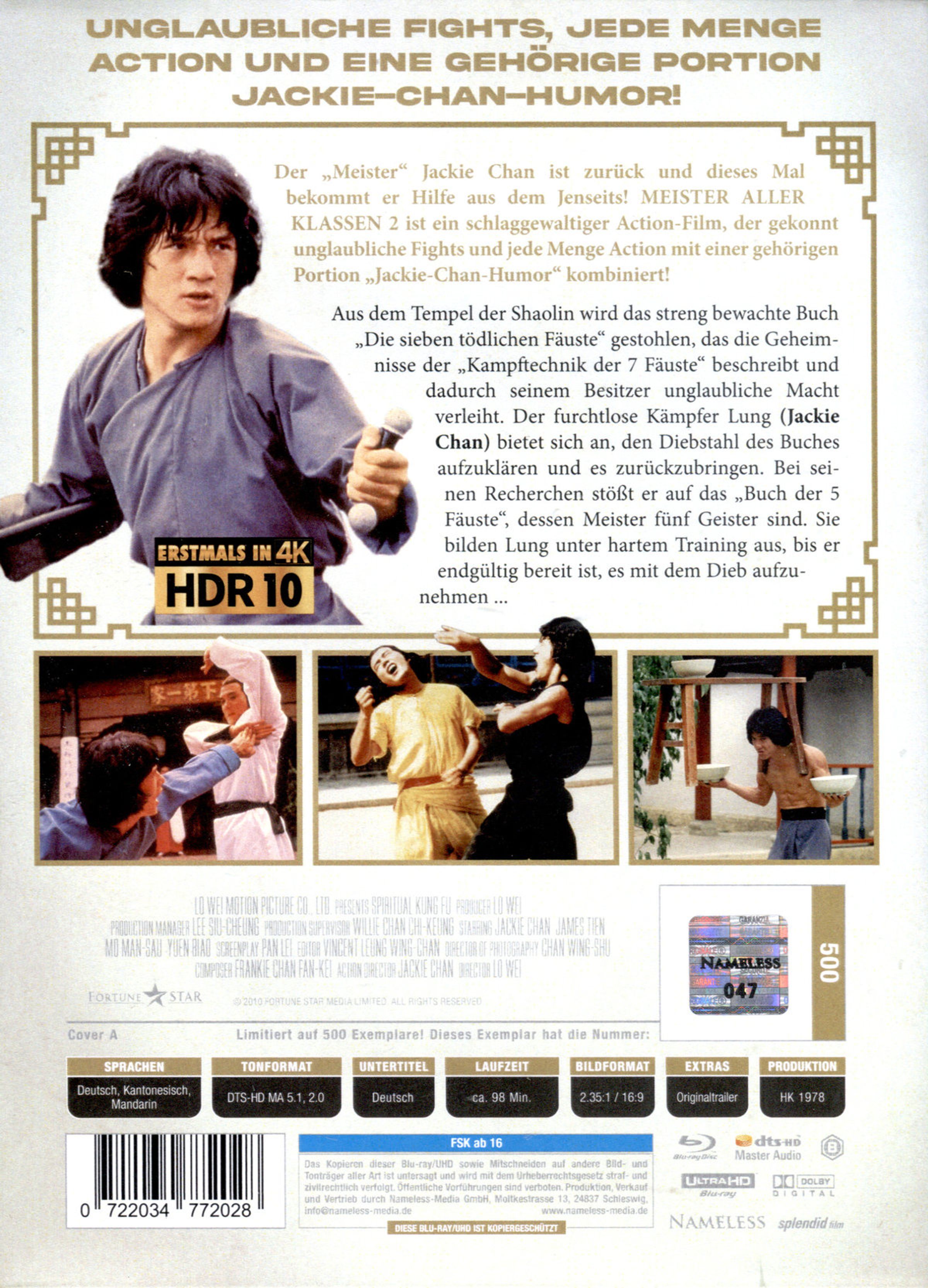 Der »Meister« Jackie Chan ist zurück und dieses Mal bekommt er Hilfe aus dem Jenseits! Meister aller Klassen 2 ist ein schlaggewaltiger Action-Film, der gekonnt unglaubliche Fights und jede Menge Action mit einer gehörigen Portion »Jackie-Chan-Humor« kombiniert! Aus dem Tempel der Shaolin wird das streng bewachte Buch »Die sieben tödlichen Fäuste« gestohlen, das die Geheimnisse der »Kampftechnik der 7 Fäuste« beschreibt und dadurch seinem Besitzer unglaubliche Macht verleiht. Der furchtlose Kämpfer Lung bietet sich an, den Diebstahl des Buches aufzuklären und es zurückzubringen. Bei seinen Recherchen stößt er auf das »Buch der 5 Fäuste«, dessen Meister fünf Geister sind. Sie bilden Lung unter hartem Training aus, bis er endgültig bereit ist, es mit dem Dieb aufzunehmen ...