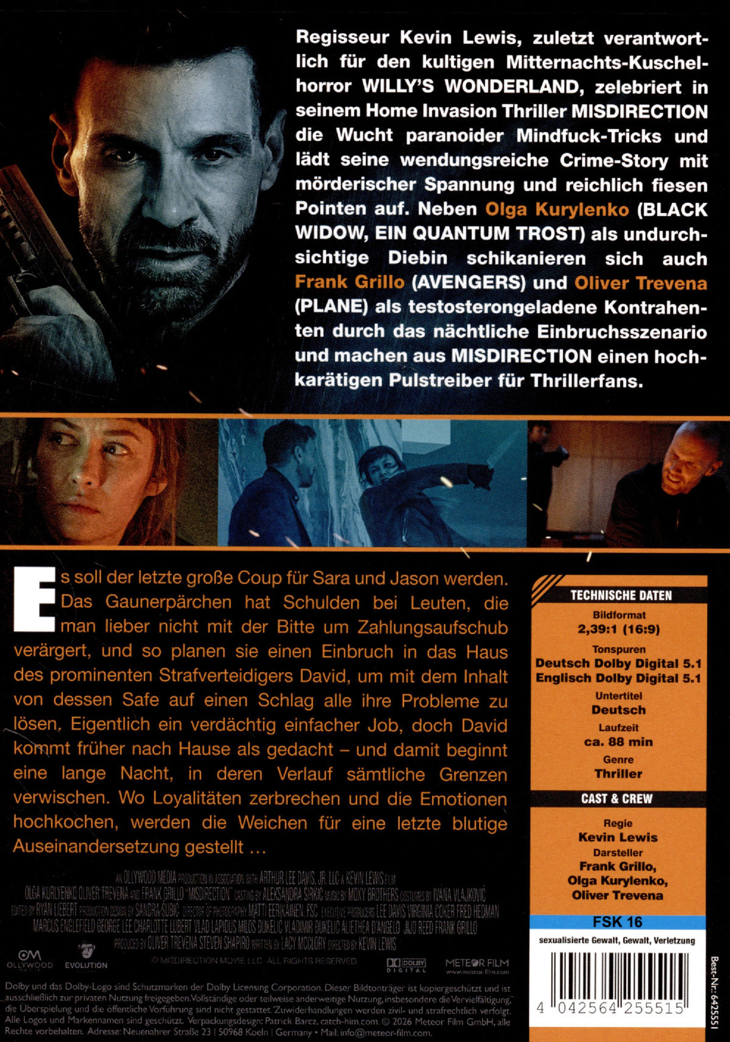 Regisseur Kevin Lewis, zuletzt verantwortlich für den kultigen Mitternachts-Kuschelhorror WILLY’S WONDERLAND, zelebriert in seinem Home Invasion Thriller MISDIRECTION: RACHE SITZT TIEF die Wucht paranoider Mindfuck-Tricks und lädt seine wendungsreiche Crime-Story mit mörderischer Spannung und reichlich fiesen Pointen auf. Neben Olga Kurylenko als undurchsichtige Diebin schikanieren sich auch Frank Grillo und Oliver Trevena als testosterongeladene Kontrahenten durch das nächtliche Einbruchsszenario und machen aus MISDIRECTION einen hochkarätigen Pulstreiber für Thrillerfans.