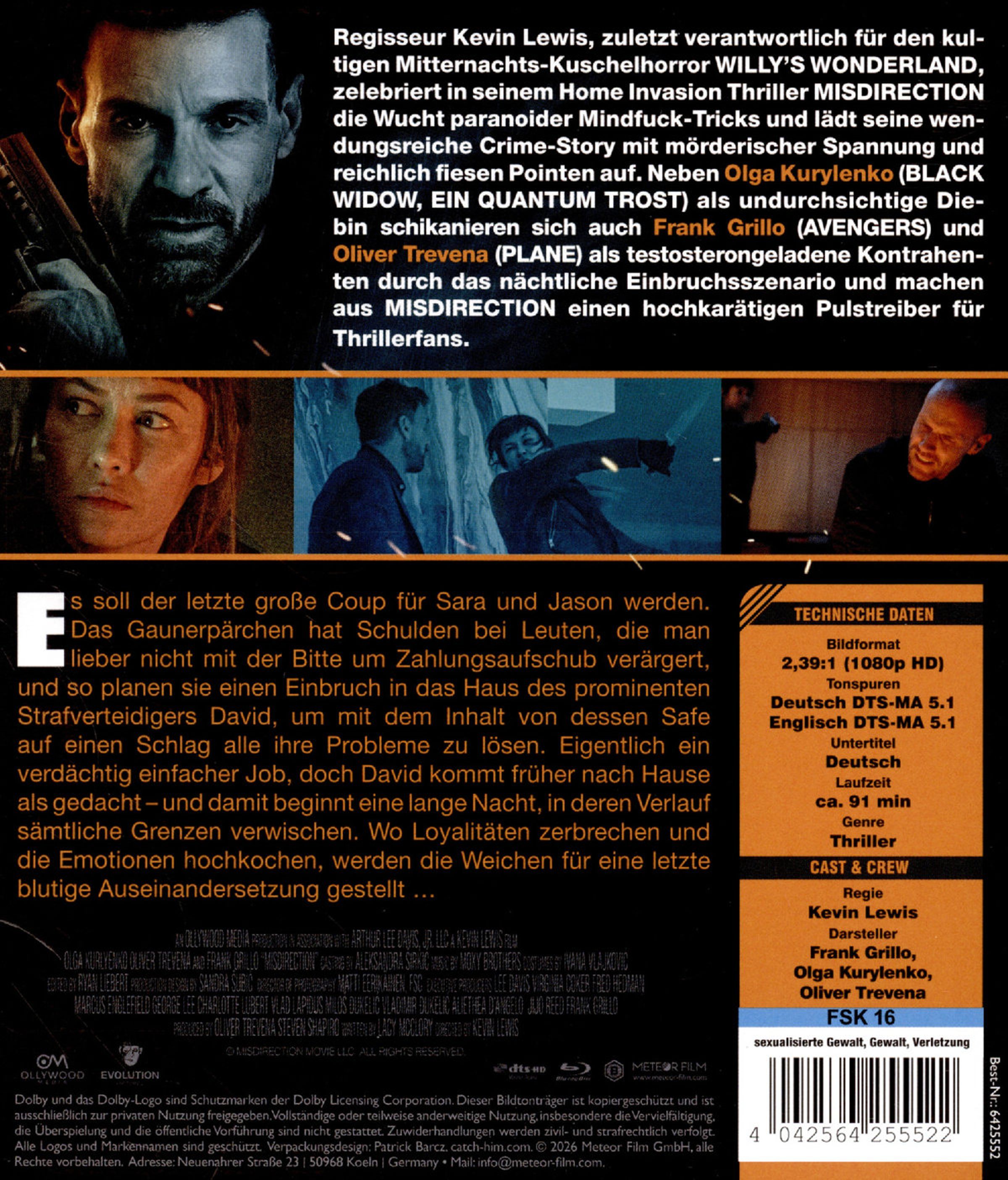 Regisseur Kevin Lewis, zuletzt verantwortlich für den kultigen Mitternachts-Kuschelhorror WILLY’S WONDERLAND, zelebriert in seinem Home Invasion Thriller MISDIRECTION: RACHE SITZT TIEF die Wucht paranoider Mindfuck-Tricks und lädt seine wendungsreiche Crime-Story mit mörderischer Spannung und reichlich fiesen Pointen auf. Neben Olga Kurylenko als undurchsichtige Diebin schikanieren sich auch Frank Grillo und Oliver Trevena als testosterongeladene Kontrahenten durch das nächtliche Einbruchsszenario und machen aus MISDIRECTION einen hochkarätigen Pulstreiber für Thrillerfans.