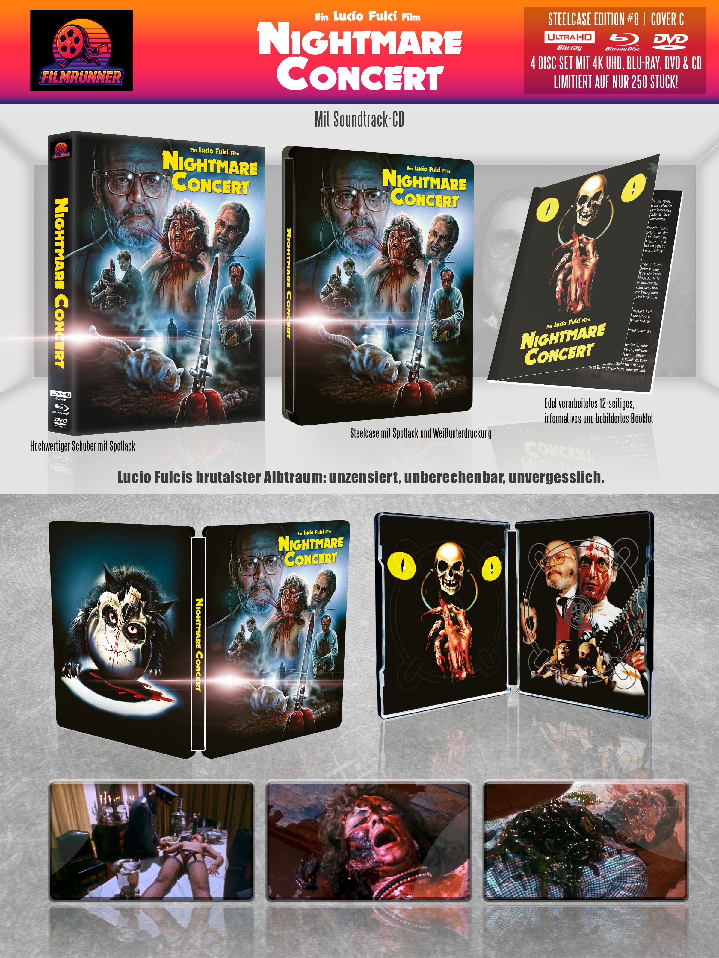 Lucio Fulci, der berüchtigte »Godfather of Gore«, präsentiert mit NIGHTMARE CONCERT einen seiner radikalsten Filme: ein selbstreflexives Splatter-Spektakel, in dem er sich selbst spielt - als Regisseur, der zwischen Albtraum und Realität den Verstand verliert und überzeugt ist, der Killer zu sein. Was folgt, ist ein grotesker Blutrausch voller Leichen, Wahnsinn und schonungsloser Effekte - ein wahres Best-of des italienischen Splatter-Kinos der späten 80er. Jahrzentelang verboten und massiv gekürzt, erscheint dieses Kultwerk in dieser Edition ungeschnitten. NIGHTMARE CONCERT ist Fulcis makabrer Abgesang - ein kompromissloses Meisterstück für Horrorfans, Sammler und alle, die sich ins Herz der Finsternis wagen.