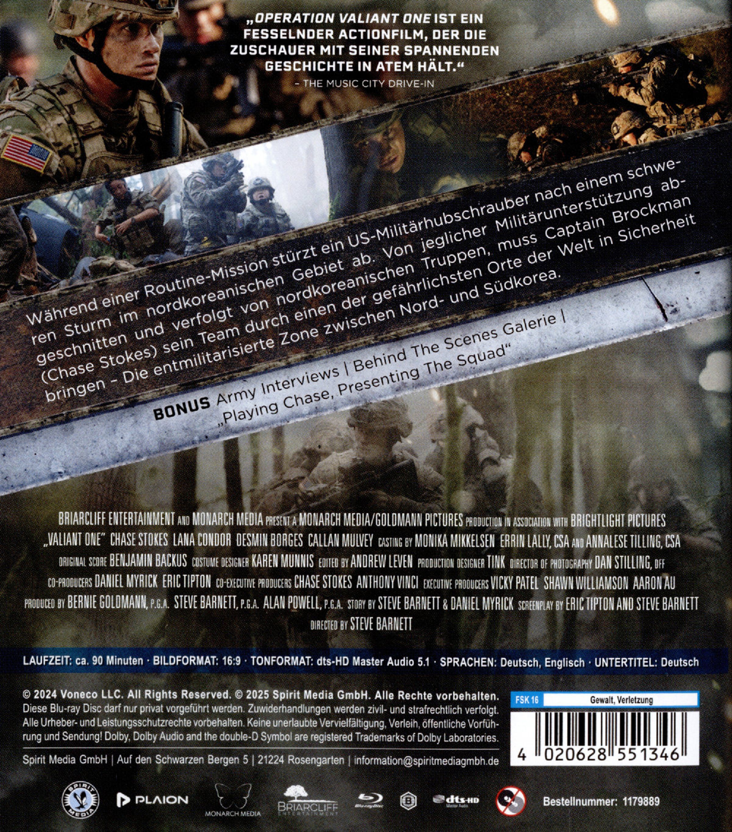 Während einer routinemäßigen Mission an der Grenze zwischen Nord- und Südkorea, stürzt ein amerikanischer Militärhubschrauber nach einem schweren Sturm im nordkoreanischen Gebiet ab. Nachdem ihr Vorgesetzter stirbt und sie von jeglicher Militärunterstützung abgeschnitten werden, müssen Captain Edward Brockman (Chase Stokes) und Sanitäterin Selby (Lana Condor) ihr Team durch feindliches Terrain führen. Nordkoreanische Truppen sind ihnen dicht auf den Fersen, als sie versuchen sich über die gefährlichste Grenze der Welt in Sicherheit zu bringen. Als ein US-Militärhubschrauber bei einer Routinemission über der koreanischen Grenze abstürzt, beginnt ein verzweifelter Überlebenskampf hinter feindlichen Linien. Ohne Kommunikation, ohne Rückhalt – und mit nordkoreanischen Truppen im Nacken – müssen der neue Captain Edward Brockman (Chase Stokes) und die mutige Sanitäterin Selby (Lana Condor) ihr Team durch das tödlichste Grenzgebiet der Welt führen. Mit einem hochkarätigen Cast und atemloser Spannung liefert Mission Valiant One einen kompromisslosen Überlebens-Thriller, in dem Mut, Zusammenhalt und Entschlossenheit über Leben und Tod entscheiden.