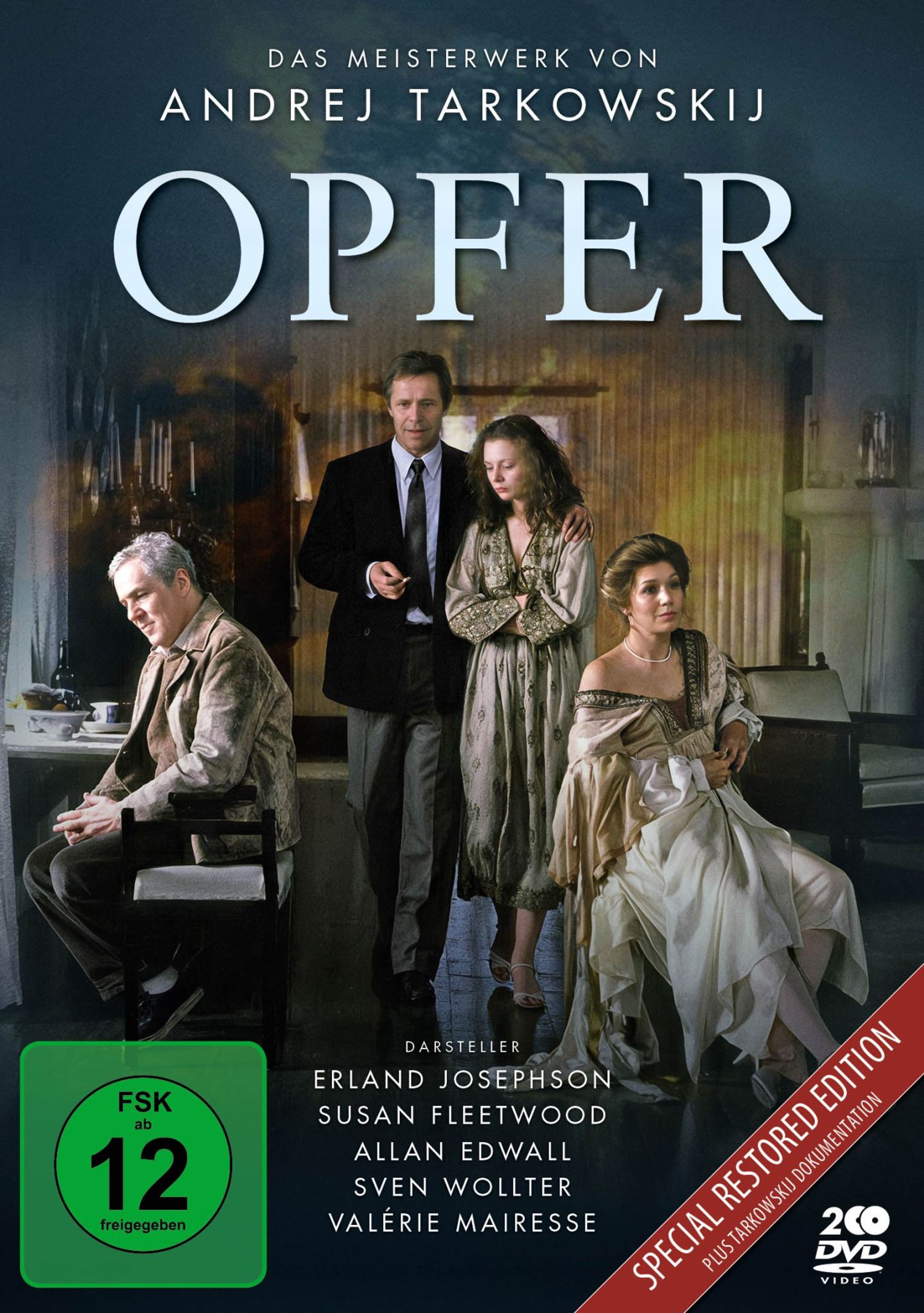 Text: "Das Meisterwerk von Andrej Tarkowskij OPFER", darunter stehen Darstellernamen. Vier Personen sind in eleganter Kleidung., 2 DVDs
