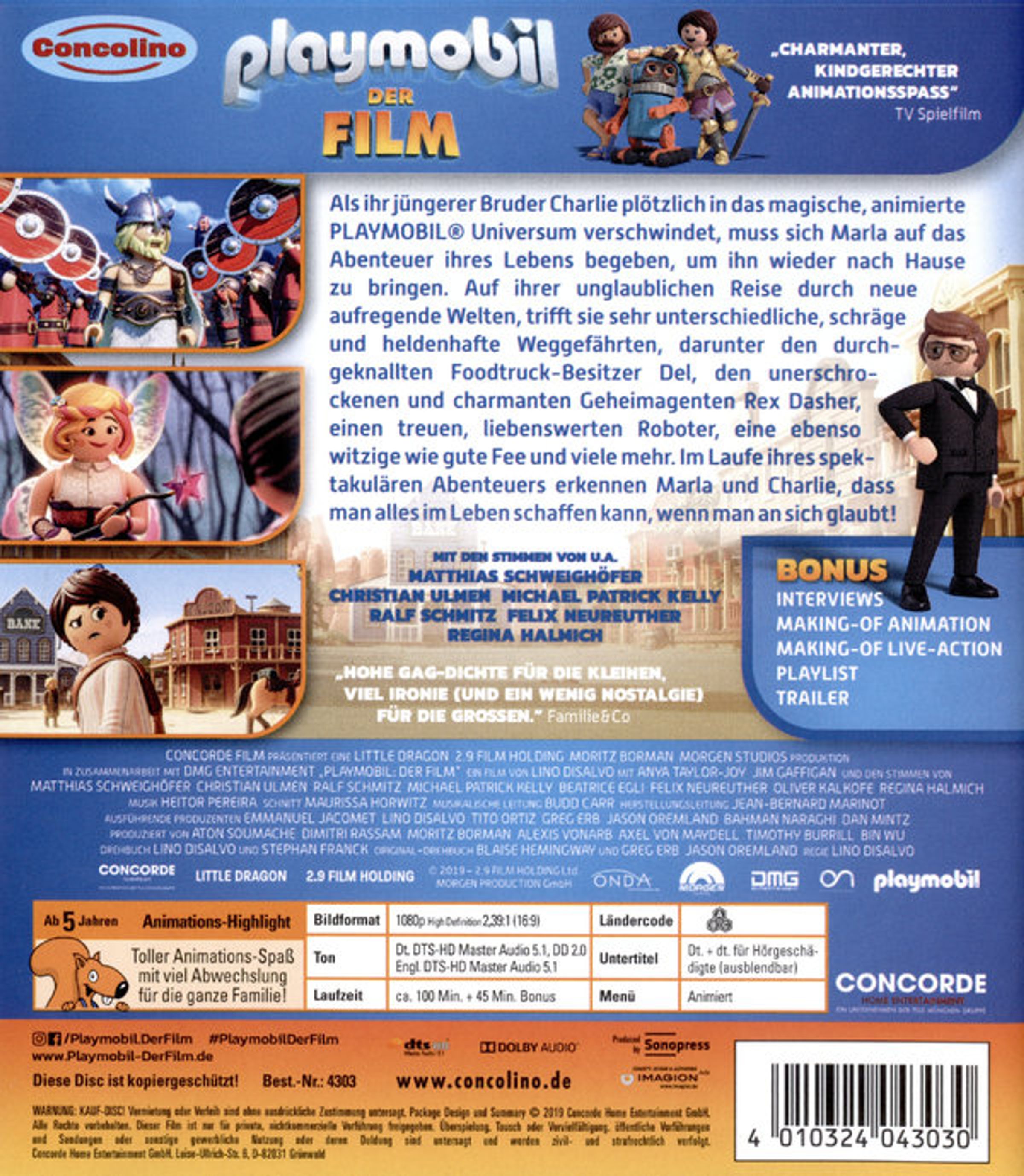 Als ihr jüngerer Bruder Charlie plötzlich in das magische, animierte PLAYMOBIL® Universum verschwindet, muss sich Marla auf das Abenteuer ihres Lebens begeben, um ihn wieder nach Hause zu bringen. Auf ihrer unglaublichen Reise durch neue aufregende Welten, trifft Marla sehr unterschiedliche, schräge und heldenhafte Weggefährten, darunter den durchgeknallten Foodtruck-Besitzer Del, den unerschrockenen und charmanten Geheim-Agenten Rex Dasher, einen treuen, liebenswerten Roboter, eine ebenso witzige wie gute Fee und viele mehr. Im Laufe ihres spektakulären Abenteuers erkennen Marla und Charlie, dass man alles im Leben schaffen kann, wenn man an sich glaubt!