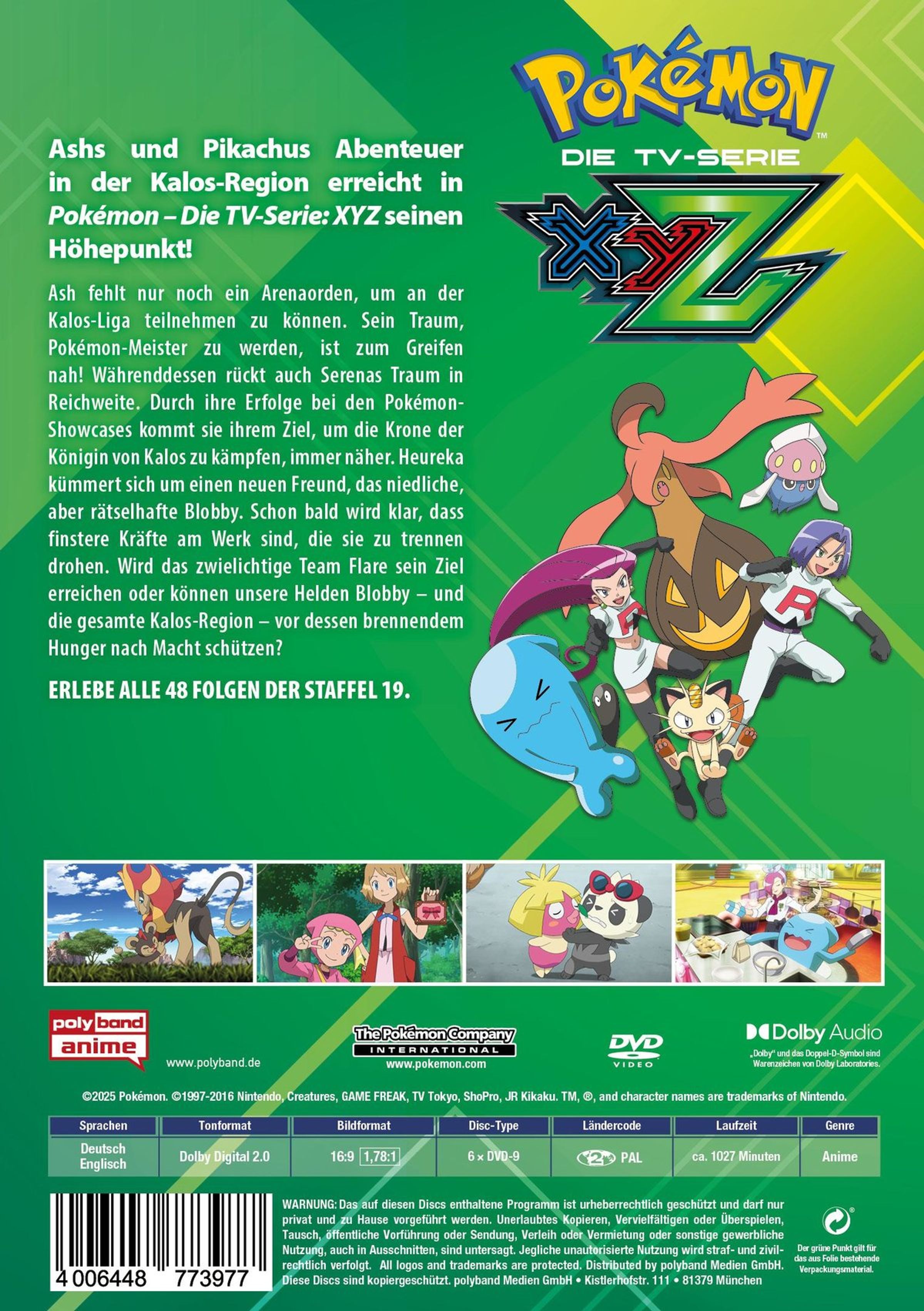 Ashs und Pikachus Abenteuer in der Kalos-Region erreicht in Pokémon - Die TV-Serie: XYZ seinen Höhepunkt! Ash fehlt nur noch ein Arenaorden, um an der Kalos-Liga teilnehmen zu können. Sein Traum, Pokémon-Meister zu werden, ist zum Greifen nah! Währenddessen rückt auch Serenas Traum in Reichweite. Durch ihre Erfolge bei den Pokémon-Showcases kommt sie ihrem Ziel, um die Krone der Königin von Kalos zu kämpfen, immer näher. Heureka kümmert sich um einen neuen Freund, das niedliche, aber rätselhafte Blobby. Schon bald wird klar, dass finstere Kräfte am Werk sind, die sie zu trennen drohen. Wird das zwielichtige Team Flare sein Ziel erreichen oder können unsere Helden Blobby - und die gesamte Kalos-Region -– vor dessen brennendem Hunger nach Macht schützen?
