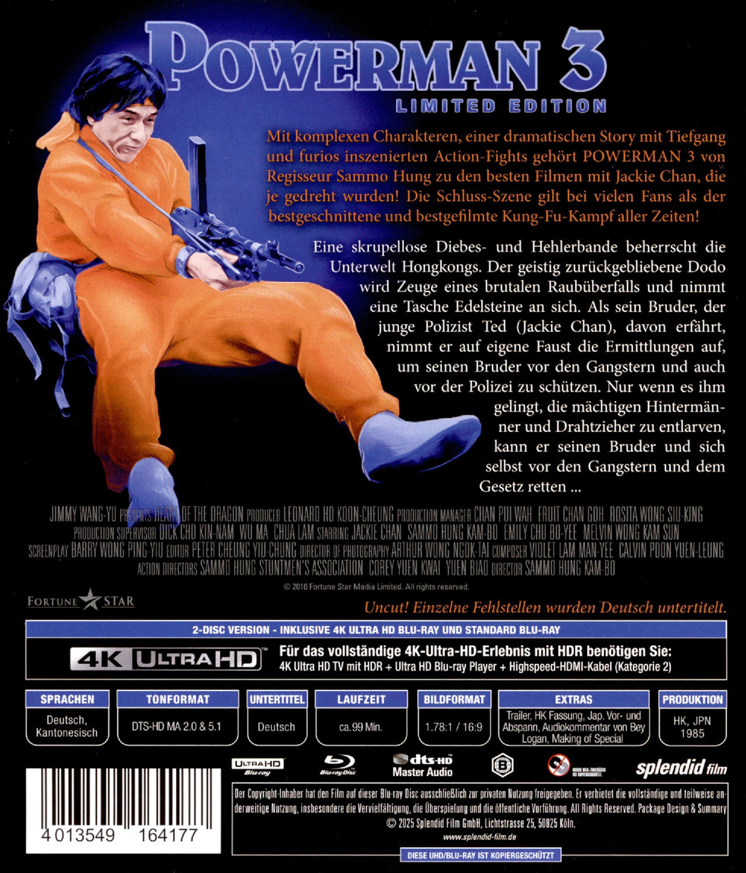 Mit komplexen Charakteren, einer dramatischen Story mit Tiefgang und furios inszenierten Action-Fights gehört »Powerman III« von Regisseur Sammo Hung zu den besten Filmen mit Jackie Chan, die je gedreht wurden! Die Schluss-Szene gilt bei vielen Fans als der bestgeschnittene und bestgefilmte Kung-Fu-Kampf aller Zeiten!