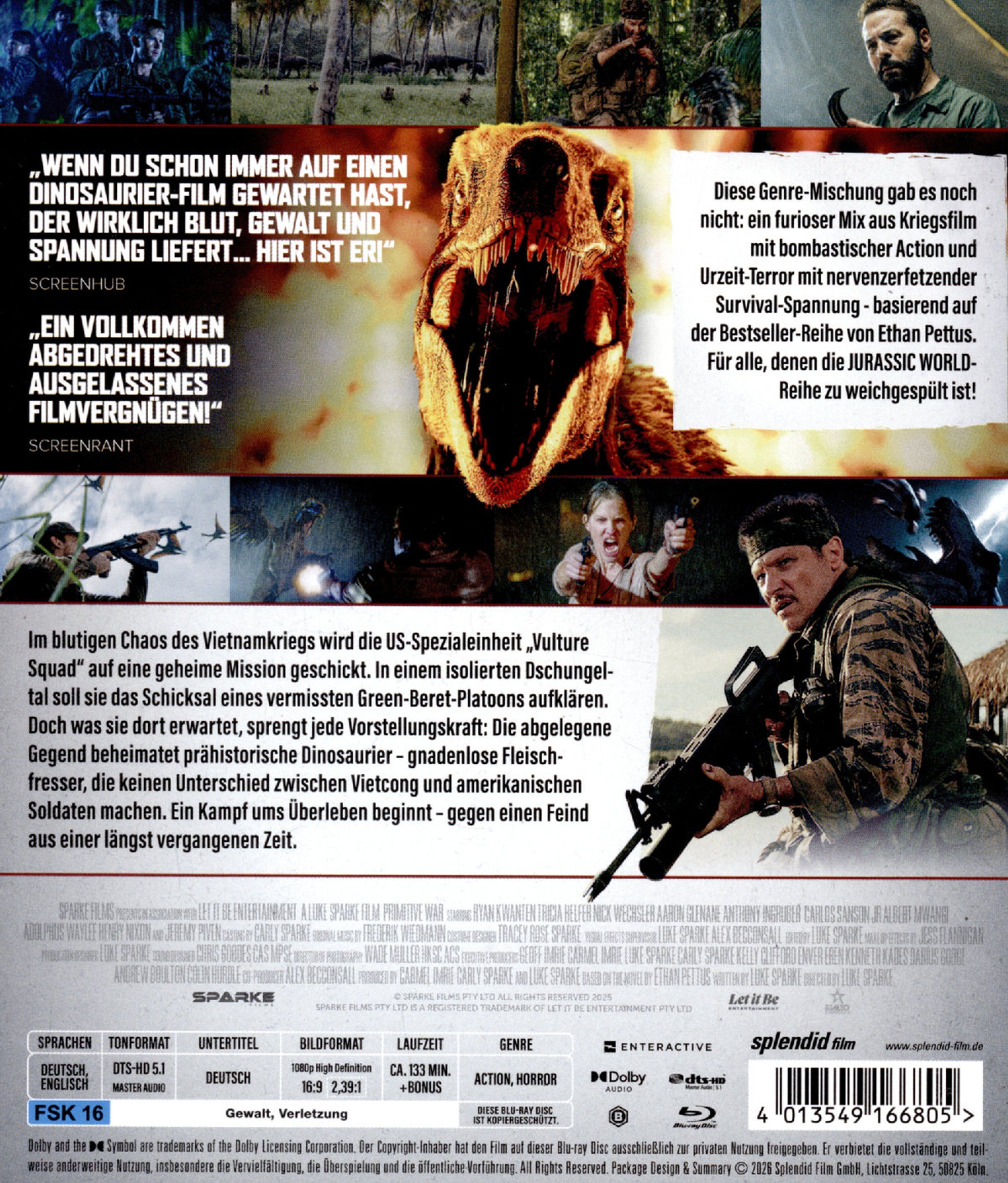 In einer Dinosaurierschädel sind ein menschlicher Schädel mit Helm und Patronen zu sehen. Texte: "PRIMITIVE WAR", "FSK 16 beantragt"., Blu-ray Disc