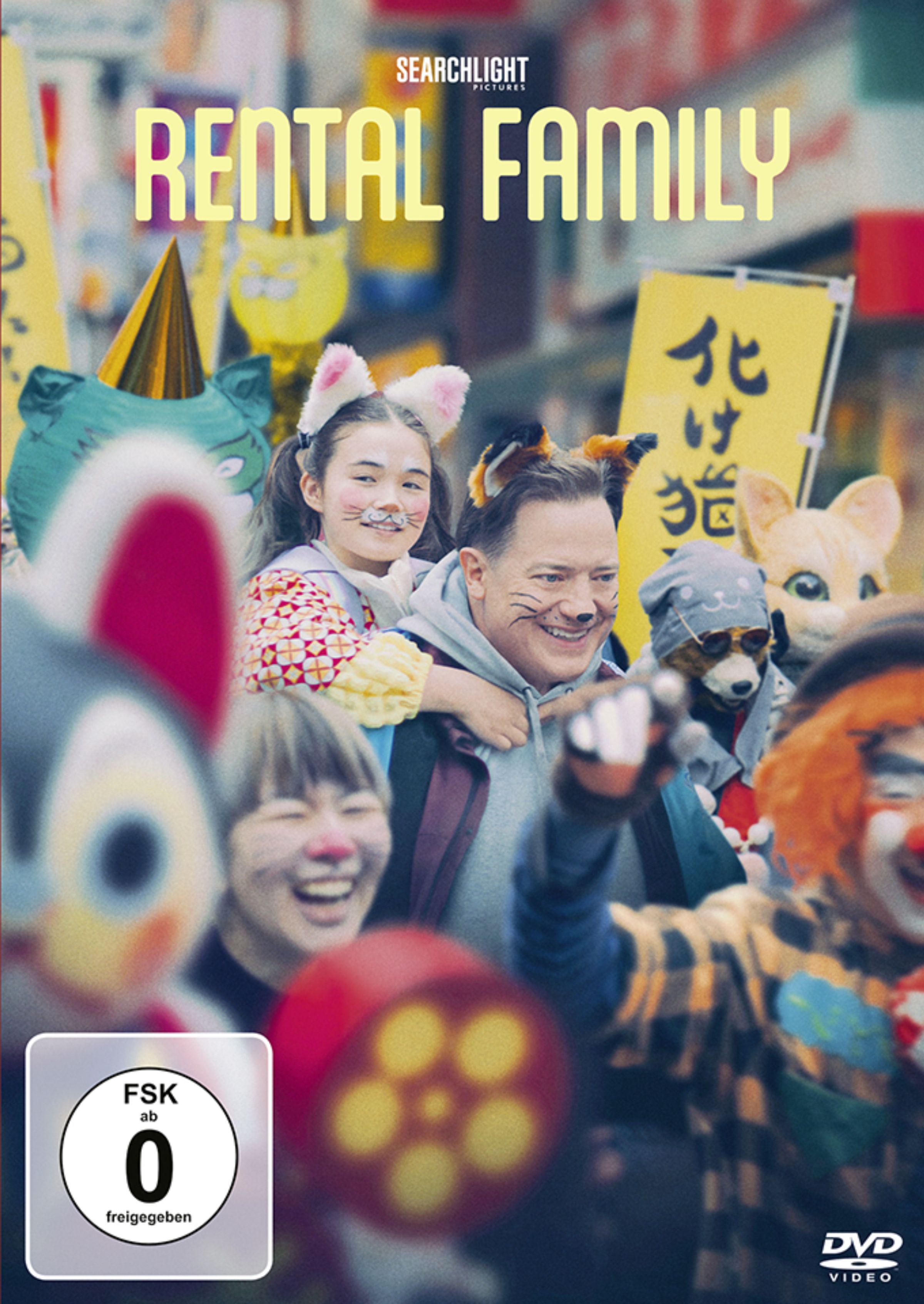 Oben steht "RENTAL FAMILY". Darunter sieht man fröhliche Menschen in Tierkostümen und mit bemalten Gesichtern., DVD