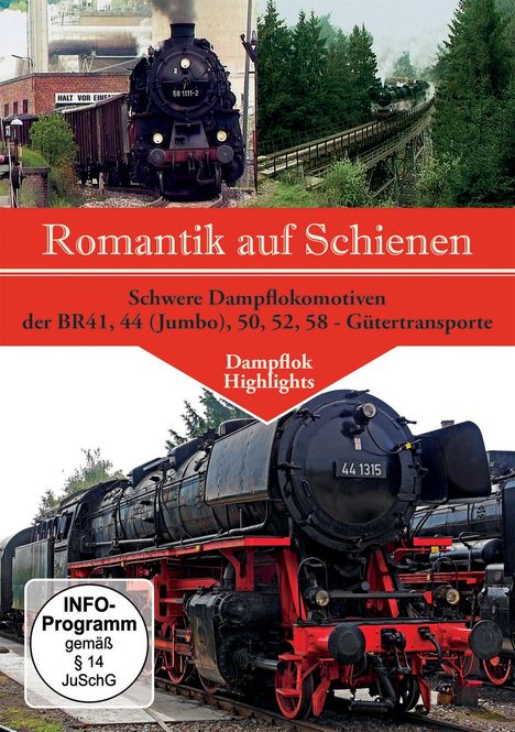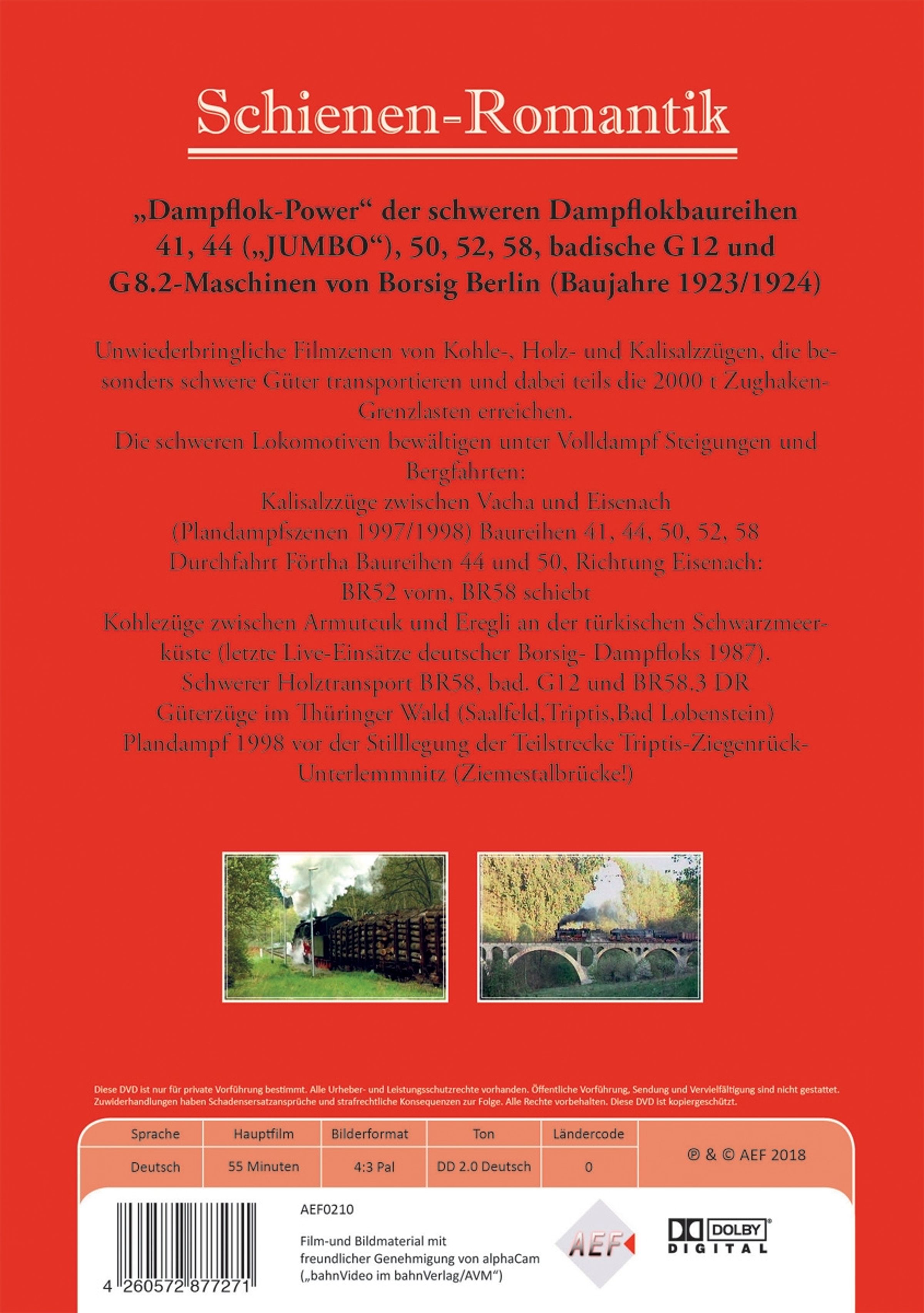 Dampflok-Power der schweren Baureihen 41, 44 (JUMBO), 50, 52, 58, badische G 12 und G 8.2 - Maschinen von Borsig Berlin (Baujahre 1923 / 1924). Unwiederbringliche Filmzenen von Kohle-, Holz- und Kalisalzzügen, die besonders schwere Güter transportieren und dabei teils die 2000 t Zughaken-Grenzlasten erreichen.
