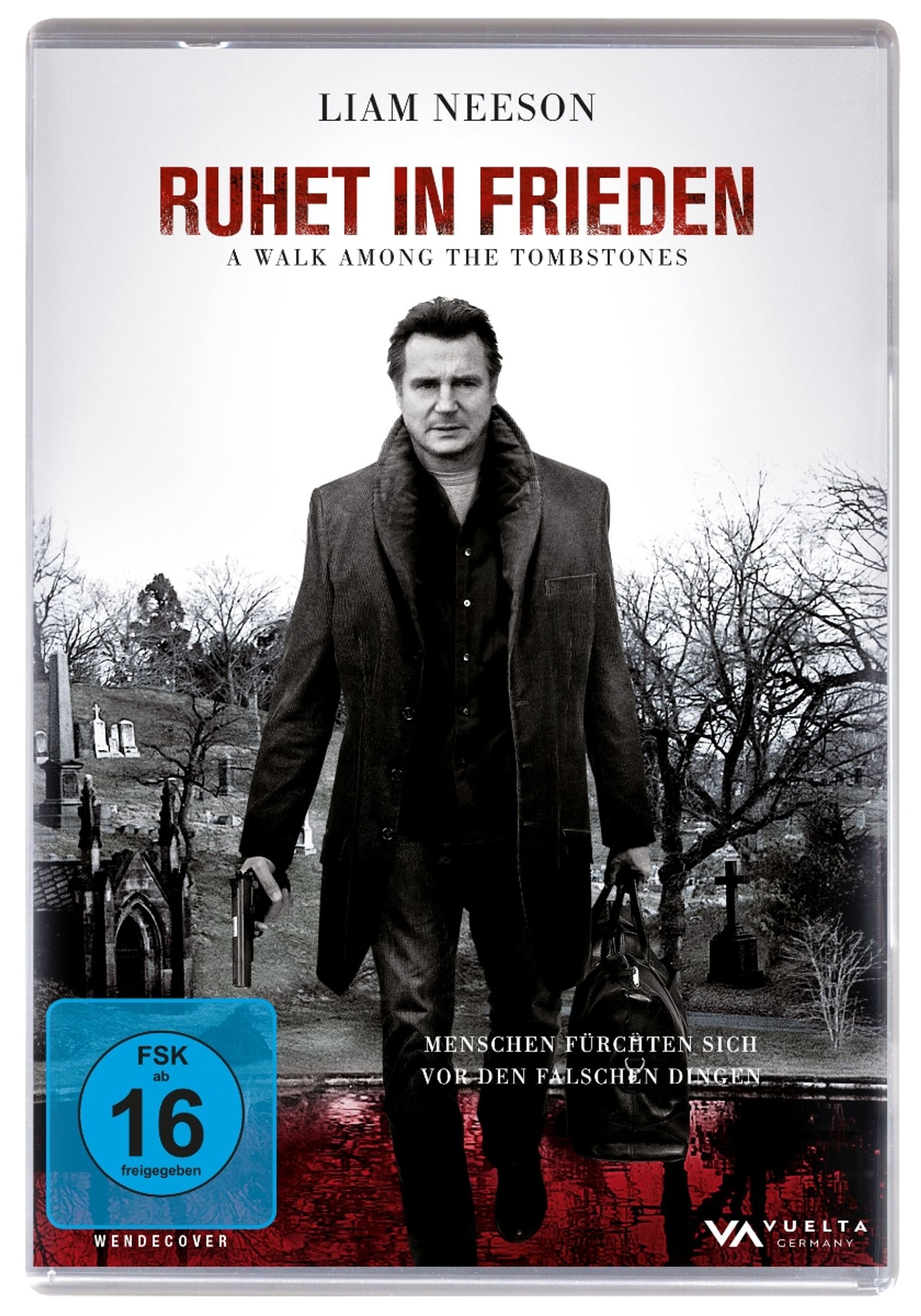 „RUHET IN FRIEDEN“ in roter Schrift, ein Mann im Mantel mit Waffe und Tasche auf einem Friedhof., DVD