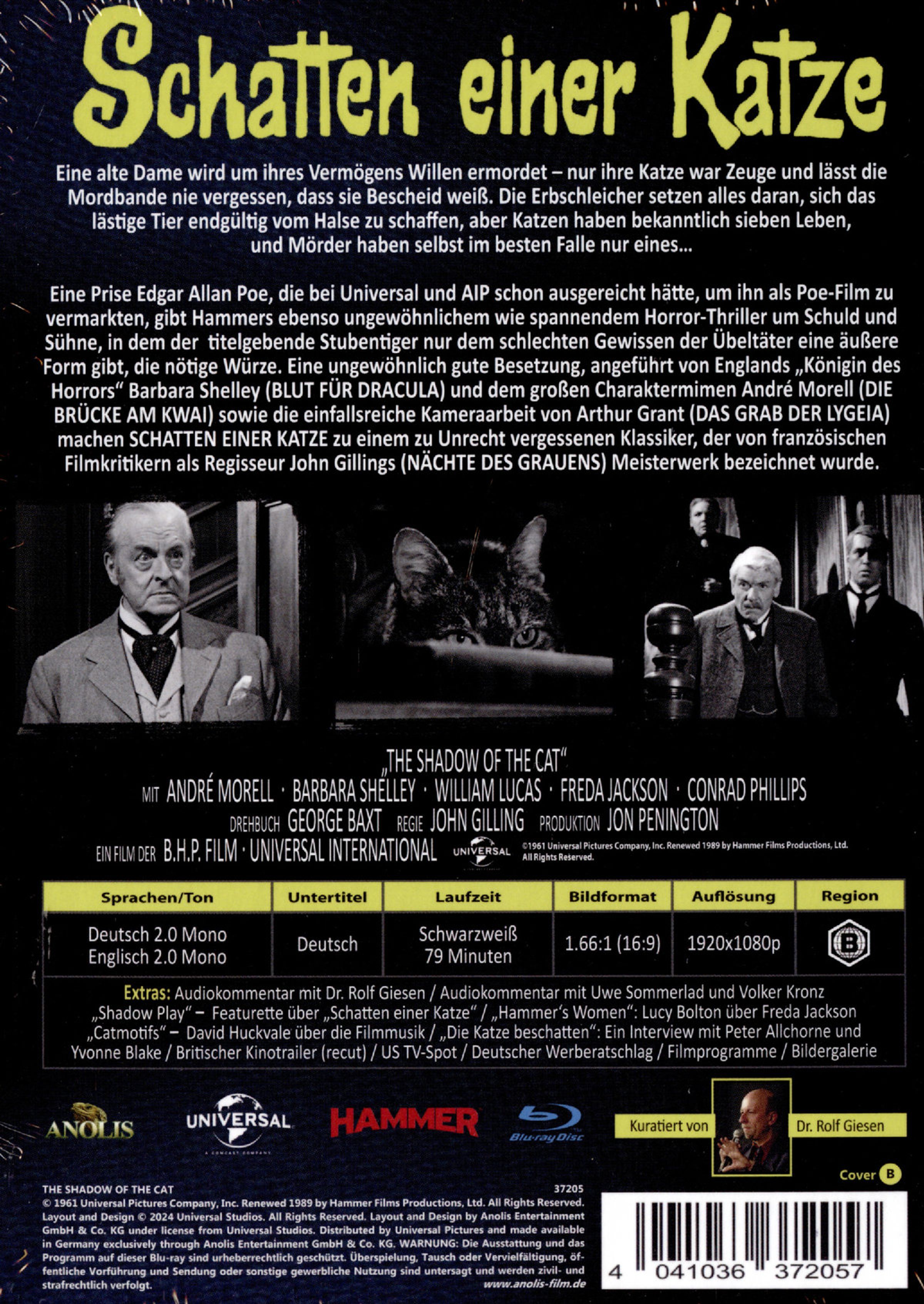 Eine Prise Edgar Allan Poe, die bei Universal und AIP schon ausgereicht hätte, um ihn als Poe-Film zu vermarkten, gibt Hammers ebenso ungewöhnlichem wie spannendem Horror-Thriller um Schuld und Sühne, in dem der titelgebende Stubentiger nur dem schlechten Gewissen der Übeltäter eine äußere Form gibt, die nötige Würze. Eine ungewöhnlich gute Besetzung, angeführt von Englands »Königin des Horrors« Barbara Shelley und dem großen Charaktermimen André Morell sowie die einfallsreiche Kameraarbeit von Arthur Grant machen zudem SCHATTEN EINER KATZE zu einem zu Unrecht vergessenen Klassiker, der von französischen Filmkritikern als Regisseur John Gillings Meisterwerk bezeichnet wurde.