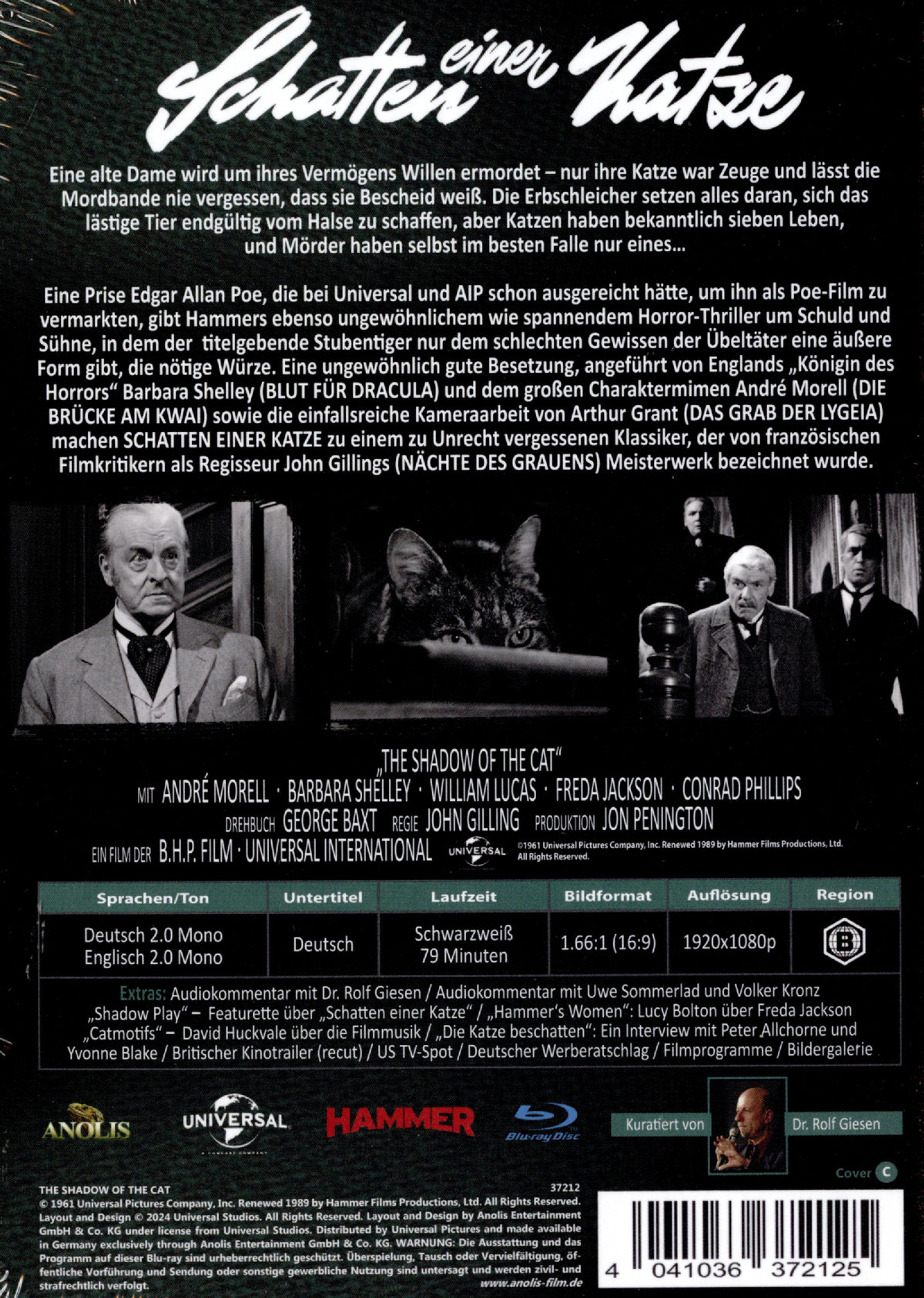 Eine Prise Edgar Allan Poe, die bei Universal und AIP schon ausgereicht hätte, um ihn als Poe-Film zu vermarkten, gibt Hammers ebenso ungewöhnlichem wie spannendem Horror-Thriller um Schuld und Sühne, in dem der titelgebende Stubentiger nur dem schlechten Gewissen der Übeltäter eine äußere Form gibt, die nötige Würze. Eine ungewöhnlich gute Besetzung, angeführt von Englands »Königin des Horrors« Barbara Shelley und dem großen Charaktermimen André Morell sowie die einfallsreiche Kameraarbeit von Arthur Grant machen zudem SCHATTEN EINER KATZE zu einem zu Unrecht vergessenen Klassiker, der von französischen Filmkritikern als Regisseur John Gillings Meisterwerk bezeichnet wurde.