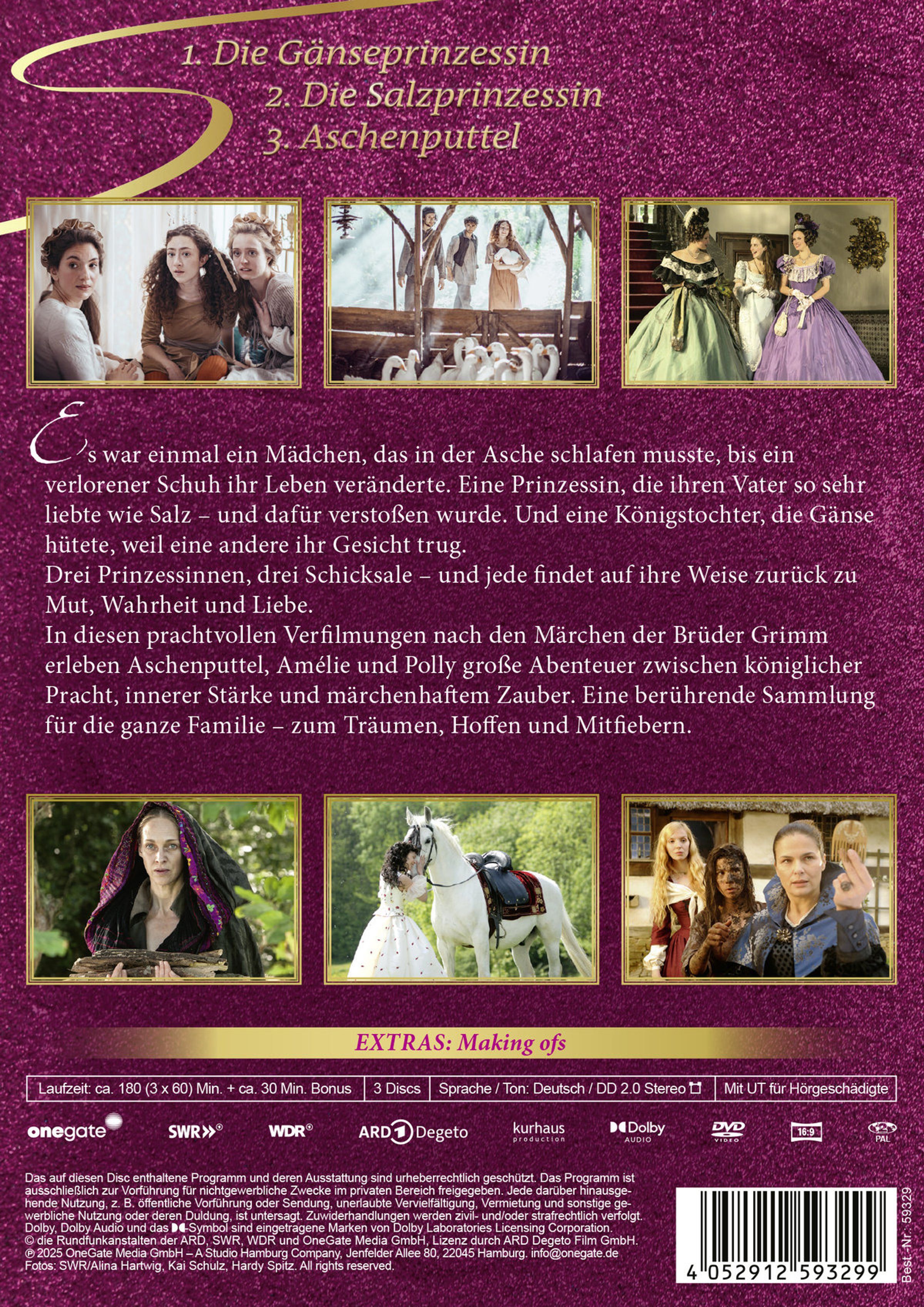In diesen prachtvollen Verfilmungen nach den Märchen der Brüder Grimm erleben Aschenputtel, Amélie und Gisella große Abenteuer zwischen königlicher Pracht, innerer Stärke und märchenhaftem Zauber. Eine berührende Sammlung für die ganze Familie - zum Träumen, Hoffen und Mitfiebern.