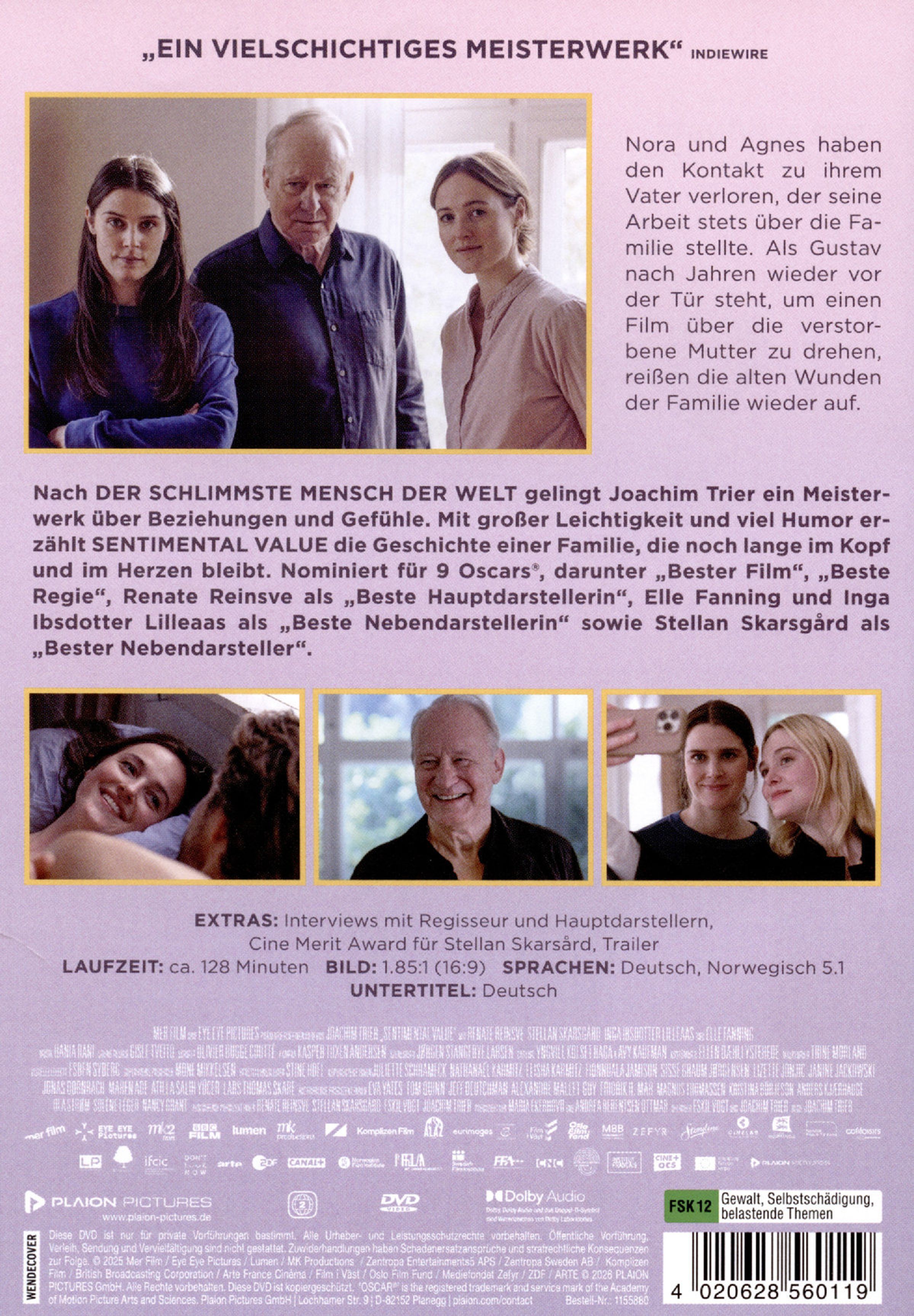 Nach DER SCHLIMMSTE MENSCH DER WELT gelingt Joachim Trier ein vielschichtiges Meisterwerk über Beziehungen und Gefühle, die nur schwer in Worte gefasst werden können. Getragen von dem großartigen Ensemble um Renate Reinsve, Stellan Skarsgård, Elle Fanning und Inga Ibsdotter Lilleaas erzählt SENTIMENTAL VALUE mit großer Leichtigkeit und viel Humor die Geschichte einer Familie, die noch lange im Kopf und im Herzen bleibt. Bei den Filmfestspielen von Cannes begeisterte SENTIMENTAL VALUE Publikum wie Kritiker gleichermaßen und wurde schließlich mit dem Großen Preis der Jury ausgezeichnet.