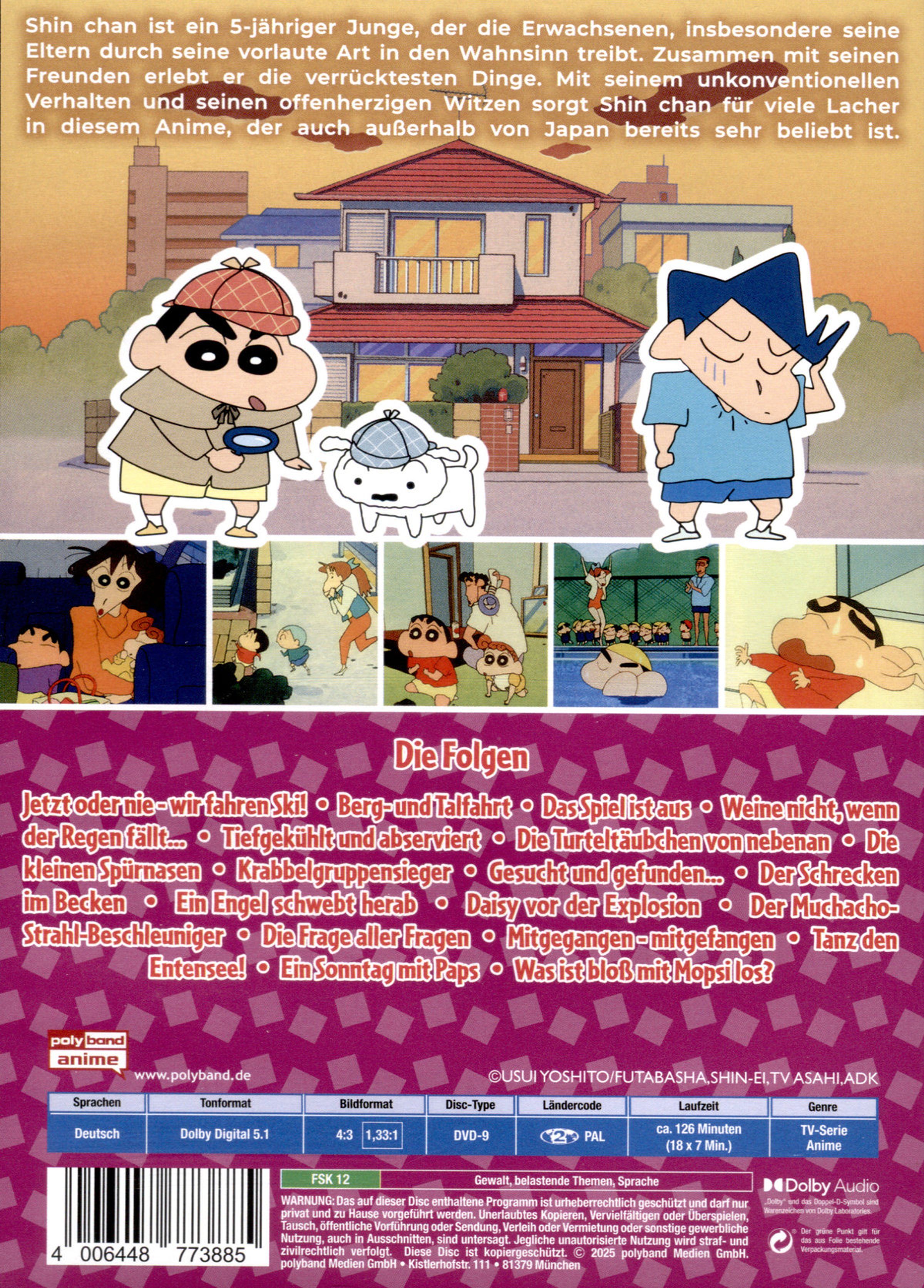 Shin chan ist ein 5-jähriger Junge, der die Erwachsenen, insbesondere seine Eltern durch seine vorlaute Art in den Wahnsinn treibt. Zusammen mit seinen Freunden erlebt er die verrücktesten Dinge. Mit seinem unkonventionellen Verhalten und seinen offenherzigen Witzen sorgt Shin chan für viele Lacher in diesem Anime, der auch außerhalb von Japan bereits sehr beliebt ist.