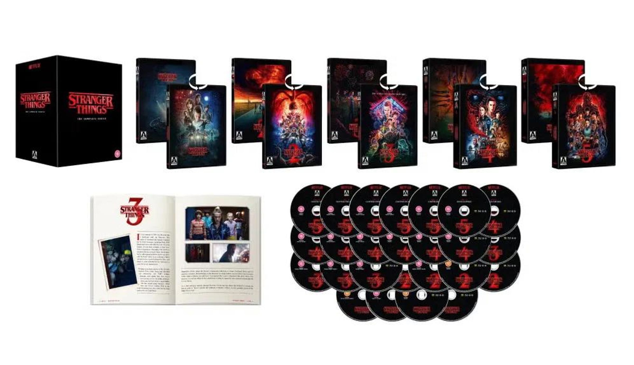 Netflix and Arrow Video are proud to present all five seasons of STRANGER THINGS for the first time on home video. This definitive, dimension-splitting collection is packed with hours of bonus features giving you an all-access behind-the-scenes look at the making of every season.
