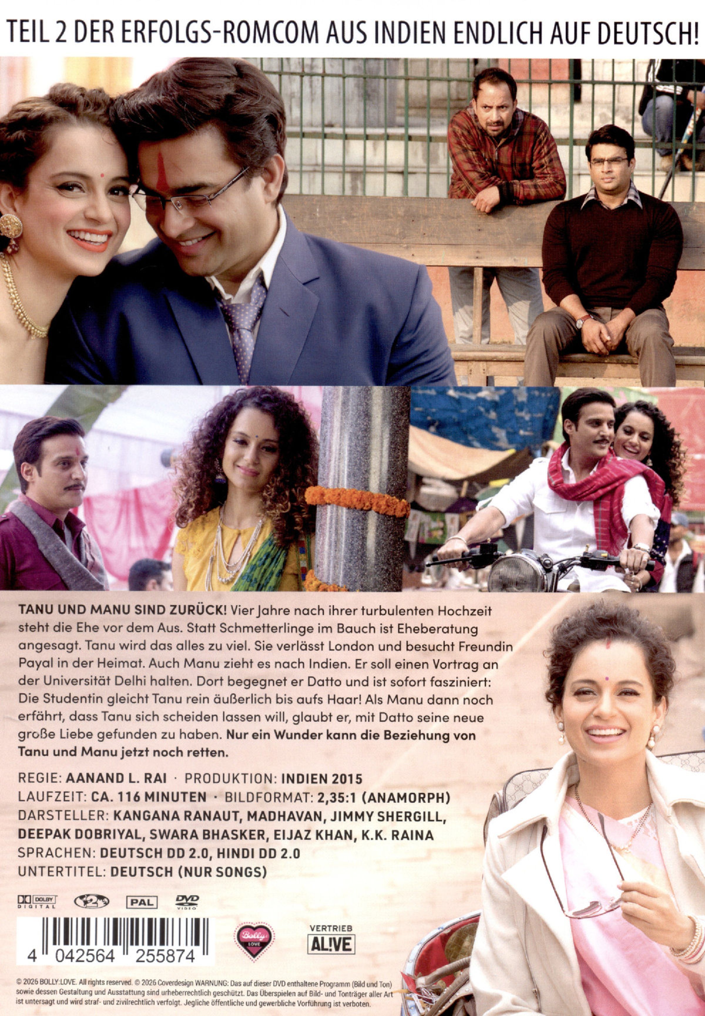 Tanu und Manu sind zurück! Vier Jahre nach ihrer turbulenten Hochzeit steht die Ehe vor dem Aus. Statt Schmetterlinge im Bauch ist Eheberatung angesagt. Tanu wird das alles zu viel. Sie verlässt London und besucht Freundin Payal in der Heimat. Auch Manu zieht es nach Indien. Er soll einen Vortrag an der Universität Delhi halten. Dort begegnet er Datto und ist sofort fasziniert: Die Studentin gleicht Tanu rein äußerlich bis aufs Haar! Als Manu dann noch erfährt, dass Tanu sich scheiden lassen will, glaubt er, mit Datto seine neue große Liebe gefunden zu haben. Nur ein Wunder kann die Beziehung von Tanu und Manu jetzt noch retten.