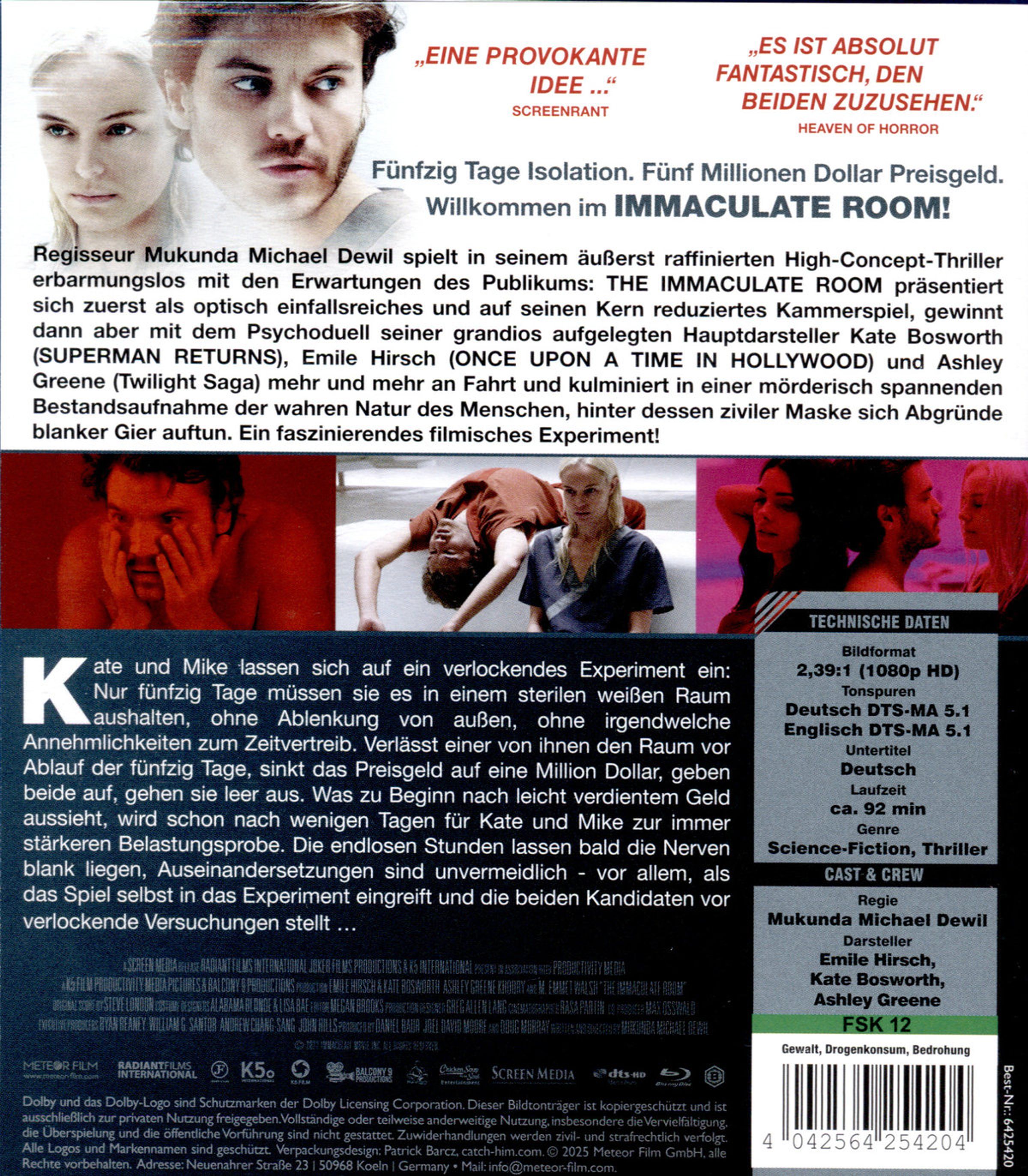 Regisseur Mukunda Michael Dewil spielt in seinem äußerst raffinierten High- Concept-Thriller erbarmungslos mit den Erwartungen des Publikums: THE IMMACULATE ROOM präsentiert sich zuerst als optisch einfallsreiches und auf seinen Kern reduziertes Kammerspiel, gewinnt dann aber mit dem Psychoduell seiner grandios aufgelegten Hauptdarsteller Kate Bosworth, Emile Hirsch und Ashley Greene mehr und mehr an Fahrt und kulminiert in einer mörderisch spannenden Bestandsaufnahme der wahren Natur des Menschen, hinter dessen ziviler Maske sich Abgründe blanker Gier auftun. Ein faszinierendes filmisches Experiment!