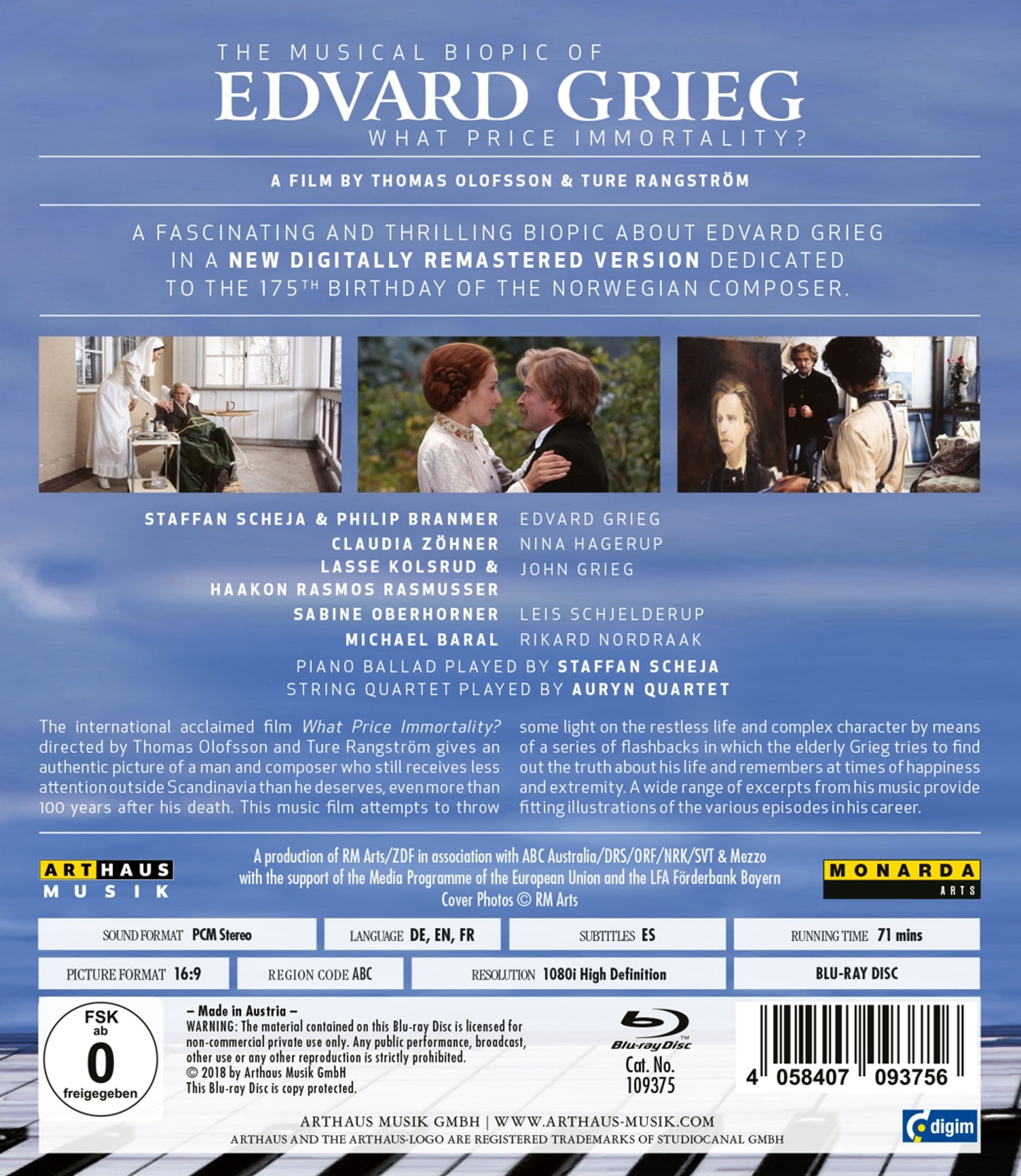 Eine faszinierende und spannende Biografie über Edvard Grieg in einer neuen digital remasterten Version. Der international erfolgreiche Film „What Price Immortality?“ (1999) von Thomas Olofsson and Ture Rangström zeigt ein authentisches Bild des Mannes und Komponisten Edvard Grieg, der selbst mehr als 100 Jahre nach seinem Tod außerhalb Skandinaviens noch viel zu wenig Beachtung findet. Der Musikfilm versucht mittels einer Serie von Flashbacks, in denen der ältere Grieg die Wahrheit über sein Leben herauszufinden versucht und sich an Zeiten von Glück und Extremität zurückerinnert, etwas Licht auf das unruhige Leben und den komplexen Charakter zu werfen. Eine Vielzahl von Ausschnitten aus seiner Musik liefert die passenden Illustrationen zu den verschiedenen Episoden seiner Karriere. Der schwedische Pianist Staffan Scheja verkörpert Edvard Grieg sowohl als Schauspieler als auch als Komponist und spielt unter anderem dessen Klavier-Ballade g-Moll, op. 24. Das weltweit bekannte Auryn-Quartett spielt das erste Streichquartett in g-Moll, op. 27. Beide Werke entstanden während der Krisenzeiten in Griegs Leben.