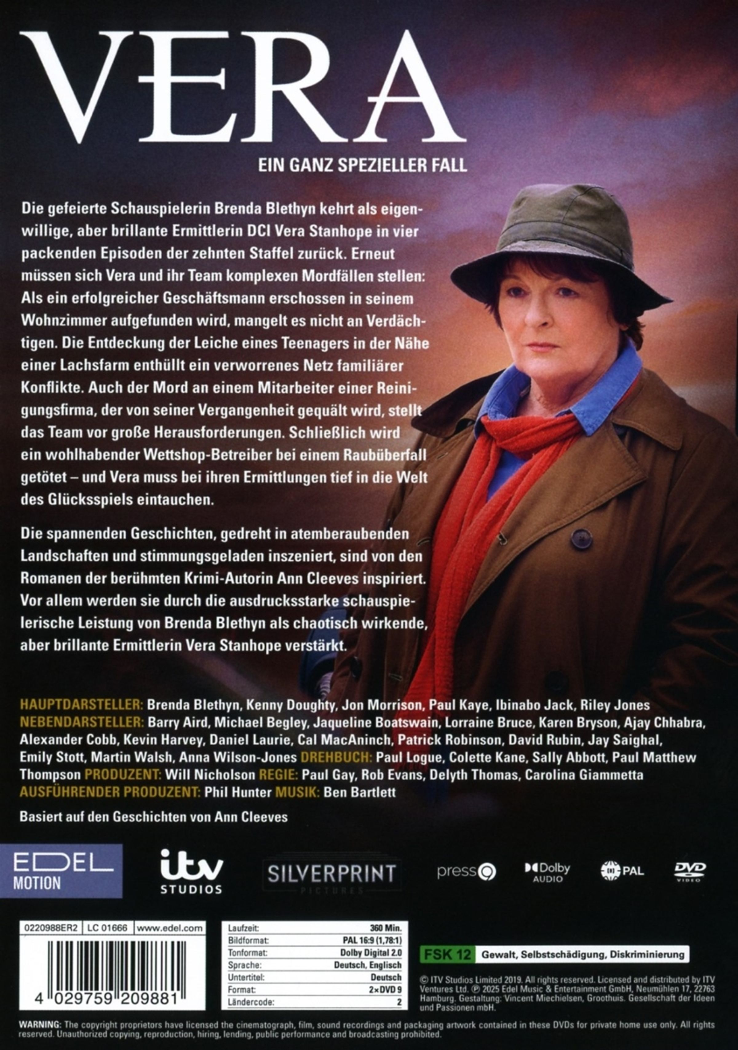 Die gefeierte Schauspielerin Brenda Blethyn kehrt als eigenwillige, aber brillante Ermittlerin DCI Vera Stanhope in vier packenden Episoden der zehnten Staffel zurück. Erneut müssen sich Vera und ihr Team komplexen Mordfällen stellen: Als ein erfolgreicher Geschäftsmann erschossen in seinem Wohnzimmer aufgefunden wird, mangelt es nicht an Verdächtigen. Die Entdeckung der Leiche eines Teenagers in der Nähe einer Lachsfarm enthüllt ein verworrenes Netz familiärer Konflikte. Auch der Mord an einem Mitarbeiter einer Reinigungsfirma, der von seiner Vergangenheit gequält wird, stellt das Team vor große Herausforderungen. Schließlich wird ein wohlhabender Wettshop-Betreiber bei einem Raubüberfall getötet - und Vera muss bei ihren Ermittlungen tief in die Welt des Glücksspiels eintauchen.