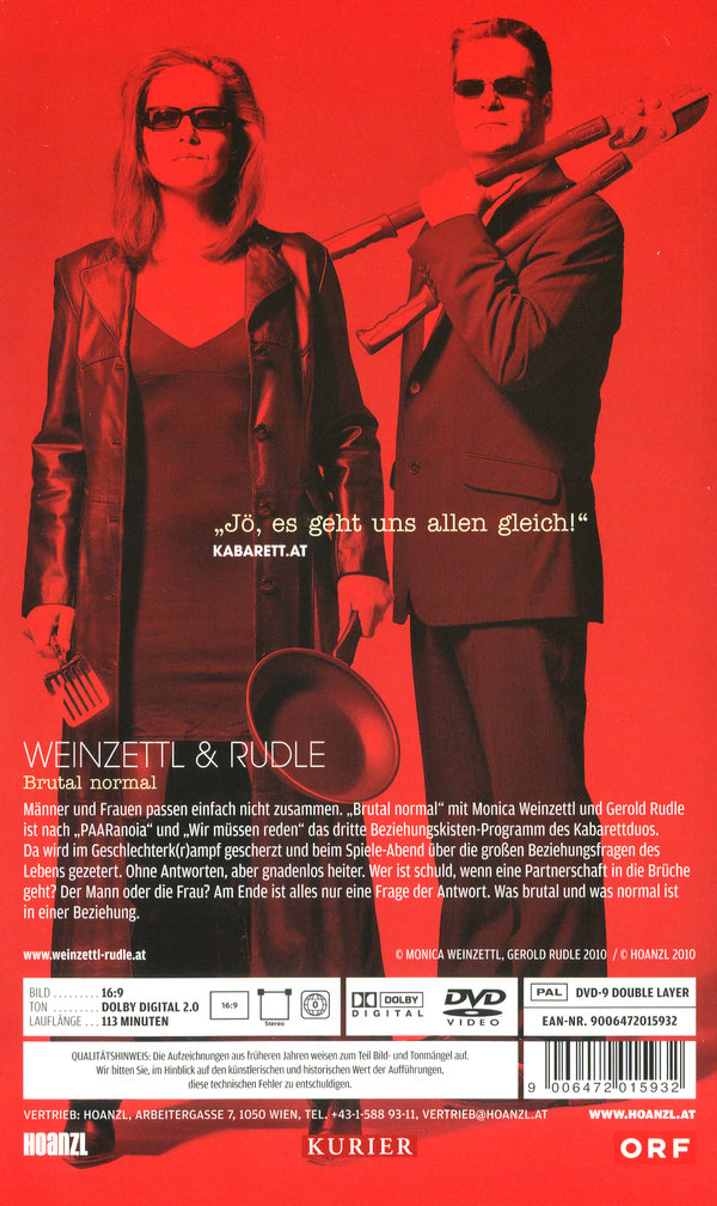 Männer und Frauen passen einfach nicht zusammen. „Brutal normal“ mit Monica Weinzettl und Gerold Rudle ist nach „PAARanoia“ und „Wir müssen reden“ das dritte Beziehungskisten-Programm des Kabarettduos. Da wird im Geschlechterk(r)ampf gescherzt und gezetert beim Spiele-Abend über die großen Beziehungsfragen des Lebens. Ohne Antworten, aber gnadenlos heiter. Wer ist schuld, wenn eine Partnerschaft in die Brüche geht? Der Mann oder die Frau? Am Ende ist alles nur eine Frage der Antwort. Was brutal und was normal ist in einer Beziehung.