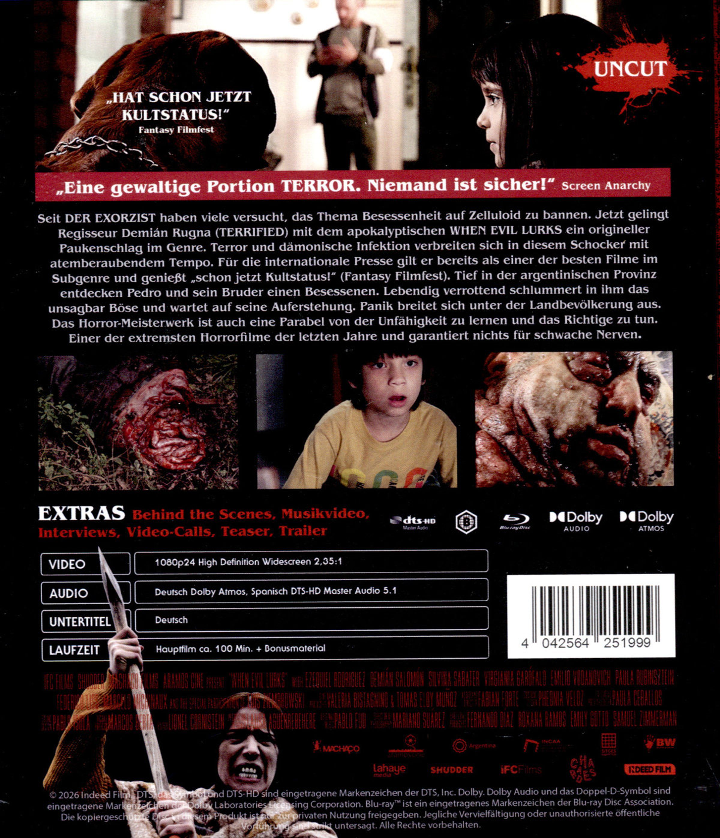Seit DER EXORZIST haben viele versucht, das Thema Besessenheit auf Zelluloid zu bannen. Jetzt gelingt Regisseur Demián Rugna mit seinem nervenzerfetzend-apokalyptischen WHEN EVIL LURKS ein origineller Paukenschlag im Genre. Terror, Grauen und die dämonische Infektion verbreiten sich in diesem Schocker mit atemberaubendem Tempo. Bei Rotten Tomatoes mit sensationellen 96% bewertet, gilt er weltweit als einer der besten Filme im Subgenre. Aber seien sie gewarnt. Das Böse bricht hier mit kompromissloser Härte aus.