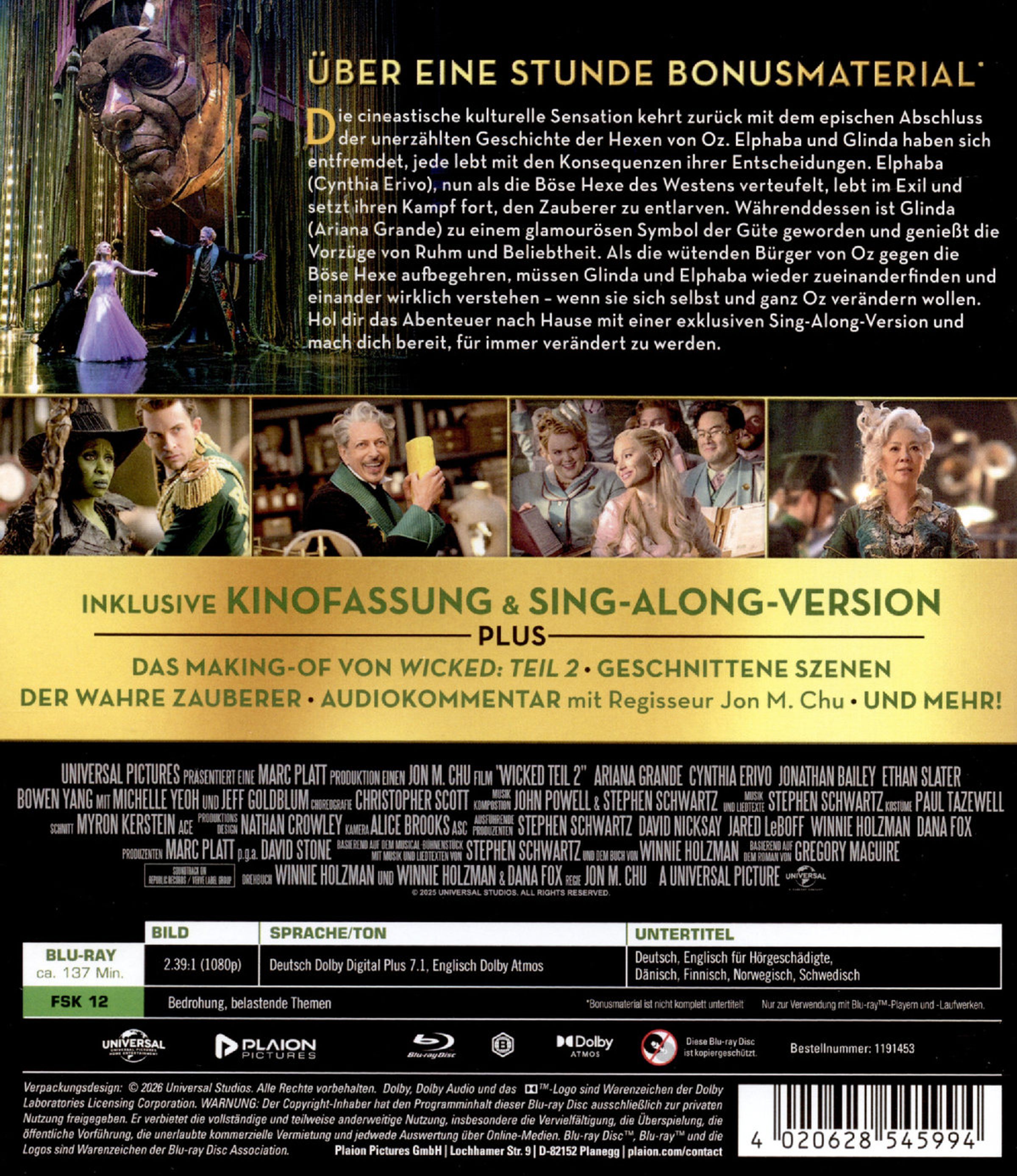 WICKED: TEIL 2 erzählt den Abschluss der unerzählten Geschichte der Hexen von Oz. Elphaba, als Böse Hexe des Westens verstoßen, kämpft im Exil für die Freiheit der Tiere und will die Wahrheit über den Zauberer enthüllen. Glinda, nun Symbol des Guten, genießt den Ruhm im Palast, leidet aber unter der Trennung von Elphaba. Während ihre geplante Hochzeit mit Fiyero naht, bedrohen Intrigen und ein Mädchen aus Kansas das fragile Gleichgewicht von Oz. Glinda und Elphaba müssen ein letztes Mal zusammenfinden, den ihre außergewöhnliche Freundschaft ist der Schlüssel zu ihrem Schicksal.