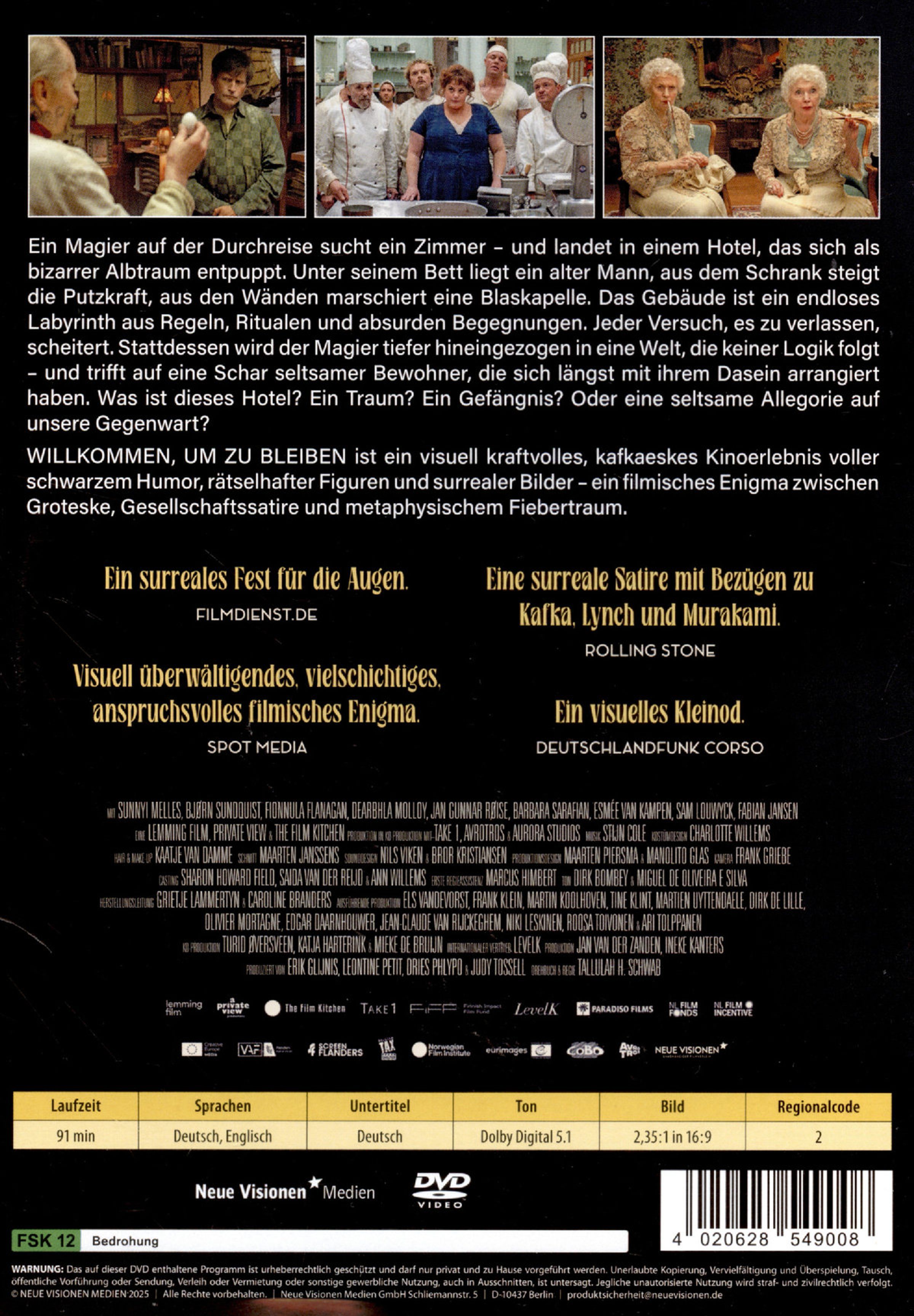 WILLKOMMEN, UM ZU BLEIBEN ist ein visuell kraftvolles, kafkaeskes Kinoerlebnis voller schwarzem Humor, rätselhafter Figuren und surrealer Bilder - ein filmisches Enigma zwischen Groteske, Gesellschaftssatire und metaphysischem Fiebertraum. WILLKOMMEN, UM ZU BLEIBEN ist ein visuell überwältigendes, schwarzhumoriges Kinoerlebnis, das tief hineinführt in die Logik eines Systems, das sich jeder Logik entzieht. Mit präziser Bildsprache, liebevoll-abgründigem Figurenkosmos und viel Gespür für das Groteske erzählt der Film von Macht, Ohnmacht und dem absurden Theater gesellschaftlicher Strukturen. Ein surrealer Trip voller Poesie, Rätsel und untergründiger Wahrheit.