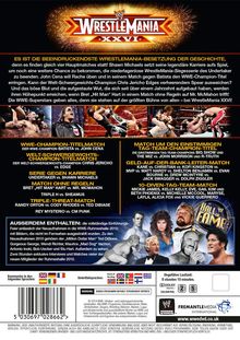 Es ist die beeindruckendste WrestleMania-Besetzung der Geschichte, denn es finden gleich vier Hauptmatches statt! Shawn Michaels setzt seine legendäre Karriere aufs Spiel, um noch eine weitere Chance zu bekommen, die niederlagenlose WrestleMania-Siegesserie des Undertaker zu beenden. John Cena will Rache üben und in seinem Match gegen Batista den WWE-Champion-Titel erringen. Kann der Welt-Schwergewichts-Champion Chris Jericho Edges verheerendem Spear ausweichen? Und das böse Blut und die aufgestaute Wut, die sich seit über einem Jahrzehnt aufgebaut haben, werden ihren Höhepunkt erreichen, wenn Bret „Hit Man“ Hart in einem Match ohne Regeln auf Mr. McMahon trifft! Die WWE-Superstars geben alles, denn sie stehen auf der größten Bühne von allen – bei WrestleMania XXVI!