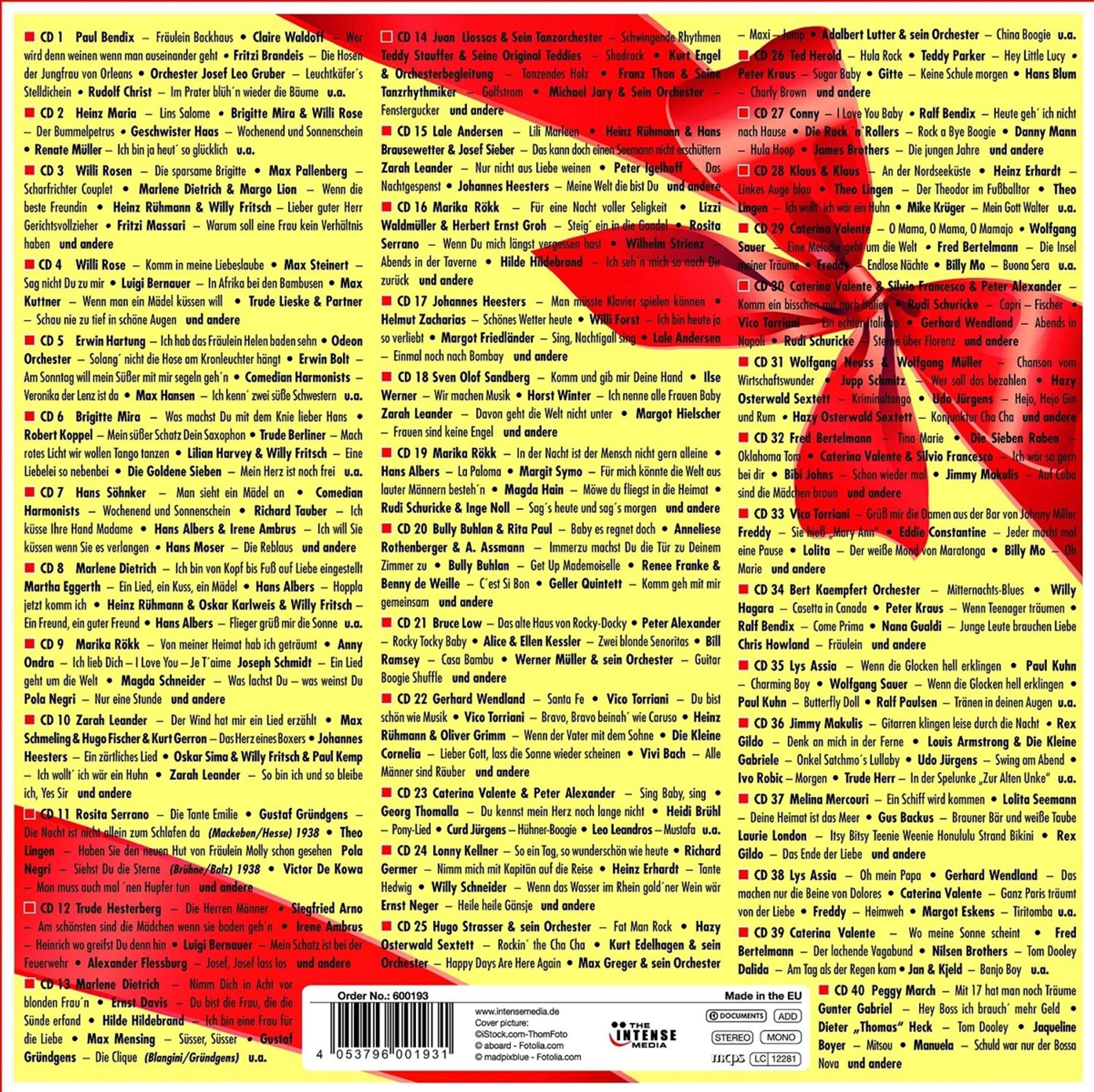 "1000 Deutsche Schlager" in großer Schrift, eine Frau im roten Tupfenkleid lächelt. "40 CD Collection" unten rechts., 40 CDs