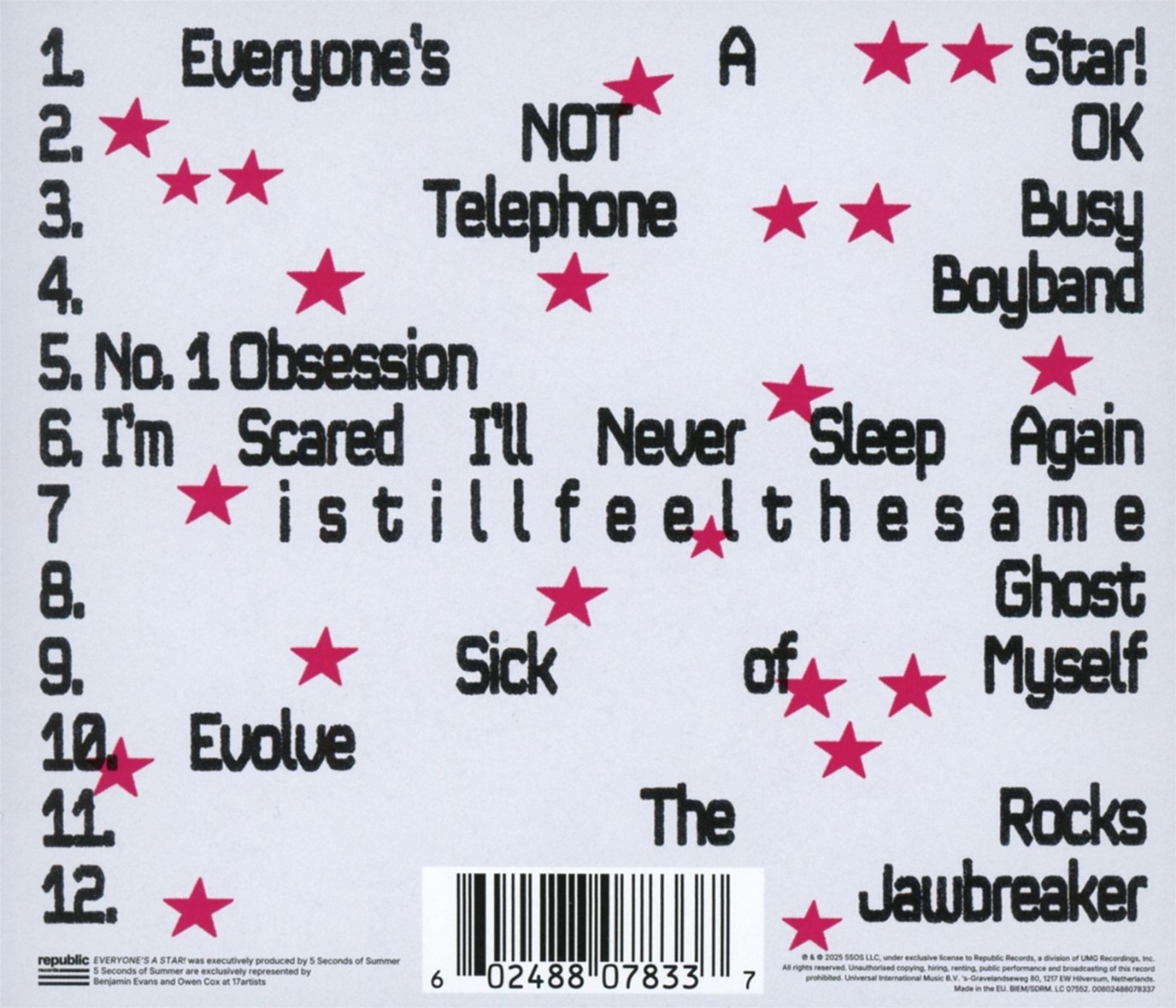 Für »Everyone's A Star!« hat 5SOS mit Top-Produzenten und Songwritern wie Julian Bunetta, John Ryan und Jason Evigan zusammengearbeitet. Das sind Namen, die auch hinter Hits von One Direction, Sabrina Carpenter, Maroon 5 und Dua Lipa stehen. So gelingt es der Band ihren Sound neu zu erfinden, ohne dabei die Essenz zu verlieren, die 5 Seconds Of Summer zu einer der bedeutendsten Pop-Bands unserer Zeit gemacht hat.