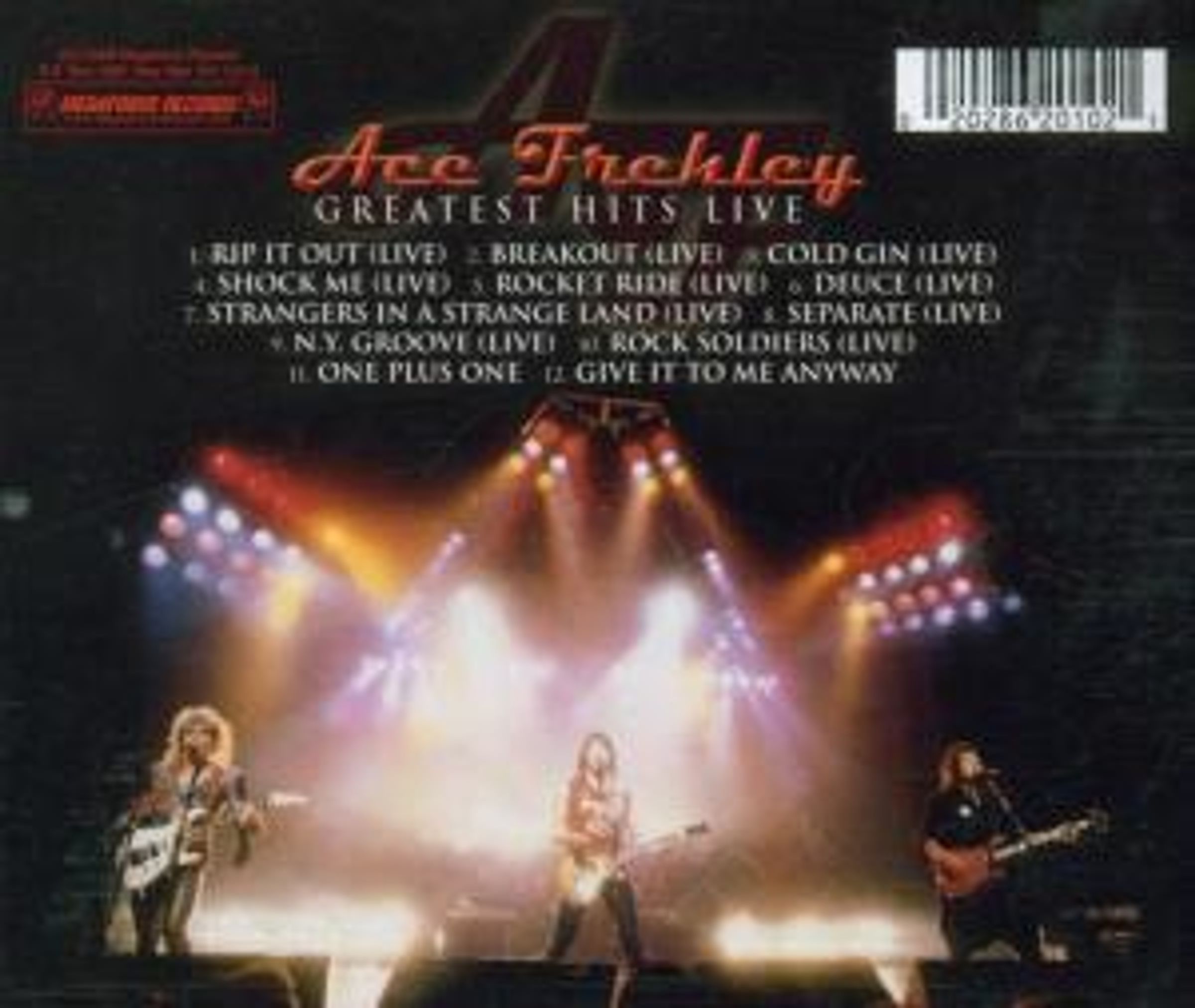"Ace Frehley Greatest Hits Live." Ein Gitarrist neigt sich nach hinten mit einer E-Gitarre, umgeben von rauchigem Hintergrund., CD