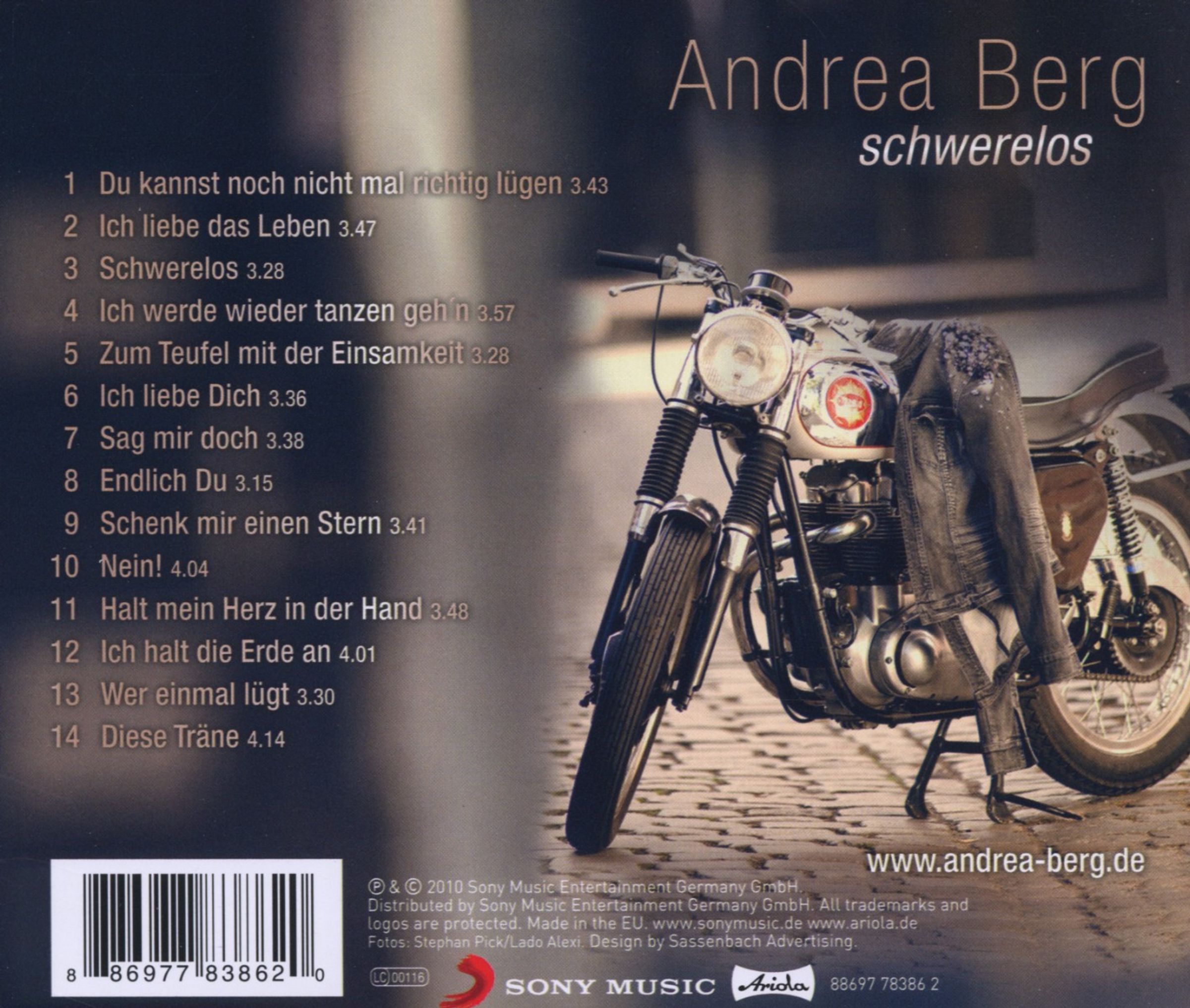 Die Biographie von Andrea Berg gleicht einer Ansammlung von Superlativen: In 18 Karrierejahren wurde jedes ihrer Alben mindestens vergoldet; die meisten erhielten mehrfach Gold und Platin. Außerdem gewann sie 5 Echos, 6 Goldene Stimmgabeln, 2Amadeus-Awards und wurde - 2008 mit dem Bundesverdienstkreuz am Bande geehrt! Mit über zwei Millionen verkauften Einheiten ihres "Best Of" - Albums hat sie eine Verkaufsdimension erreicht, die alle Normen der Musikindustrie aushebelt. 2003 schaffte sie mit ihrem Album "Machtlos" als erste Schlager-Interpretin seit über 20 Jahren den Sprung auf Platz 1 der deutschen Verkaufscharts. Mit "Schwerelos" legt Andrea Berg ein fantastisches neues Album vor. Zum ersten Mal produziert von Dieter Bohlen. 14 brandneue Lieder geprägt von Sehnsucht, Träumen und Leidenschaft , werden die Fans verzaubern und viele schöne Augenblicke bescheren. Ende September wird bereits die erste Promo-Single aus dem Album veröffentlicht: "Du kannst noch nicht mal richtig lügen", ein potentieller Hit, unverkennbar Andrea Berg. Mit Songs wie "Ich liebe dich", Wenn die Sterne tanzen", "Diese Träne" oder dem Bonustrack "Ich liebe das Leben" erzeugt Andrea Gänsehaut .