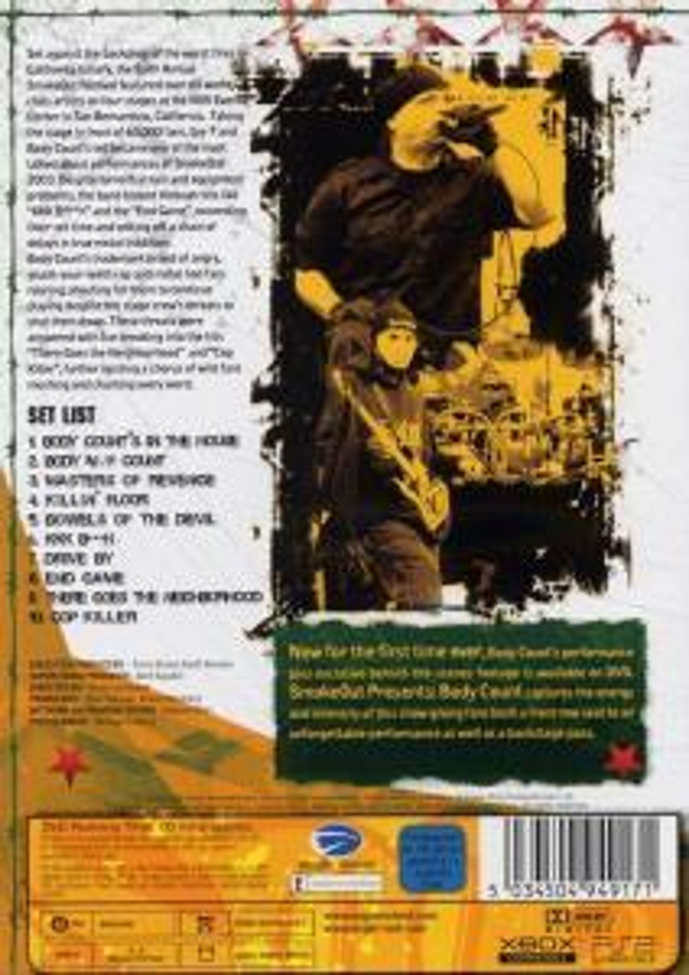 Set against the backdrop of the worst fires in Californian history, the Sixth Annual Smoke Out Festival featured over 40 world-class artists on four stages at the NOS Events Center in San Bernardino, California. Taking the stage in front of 60, 000 fans, Ice T and Body Count’s set became one of the most talked about performances of Smokeout 2003. Despite torrential rain and equipment problems, the band blazed through hits like “KKK Bitch” and “The End Game”. Body Count’s trademark brand of angry, gnash your teeth rap and metal had fans roaring, shouting for them to continue playing despite the stage crew’s threats to shut them down. Now for the first time ever, Body Count’s performance plus exclusive behind the scenes footage is available on DVD. Shot in hi-def with Stereo and 5.1 Surround Sound, Smokeout Presents: Body Count captures the energy and intensity of this show giving fans both a front row seat to an unforgettable performance as well as a backstage pass.