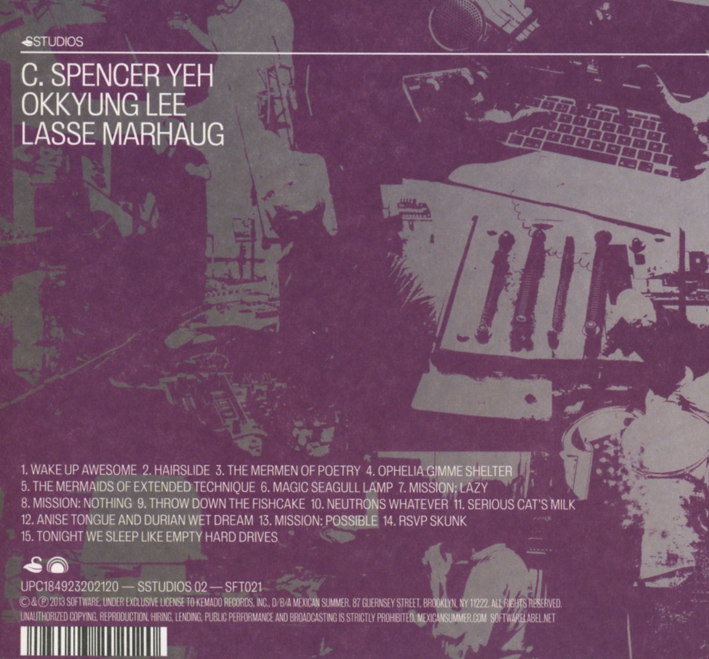 Wake Up Awesome, by C. Spencer Yeh (Burning Star Core), Okkyung Lee, and Lasse Marhaug (Jazzkamer), is the second chapter of Software Studio Series - a new venture in the Software Recording Co.'s expanding catalog that invites artists in the field of electronic music to create collaborative works of quality and vision. Inspired by the historical intersections of live performance and studio post-production, Wake Up Awesome is a modern kind of fusion in technique as well as genre. At its core are three artists highly experienced with both instant and labored composition. Together, they found the studio generated improvisations were iteratively developed by each on their own. Passages of real-time improvisation duck and swerve into electro-concrete tangles of samples, edits and juxtaposition – all you'd want out of a world of mechanical possibility. If it sounds intentional on the record, it was. If Yeh and Marhaug's more electronic affinities in their respective practices place them as the "producers," then Lee's cello often leads the drive as a sort of soloist. The resulting conversation is genuinely both serious and iconoclastic. All three artists have a history of dialogue, but this is the first time they've hung out for the record -- we're very happy that they did. Wake Up Awesome is available via the Software in limited vinyl edition as well as CD and digital formats.