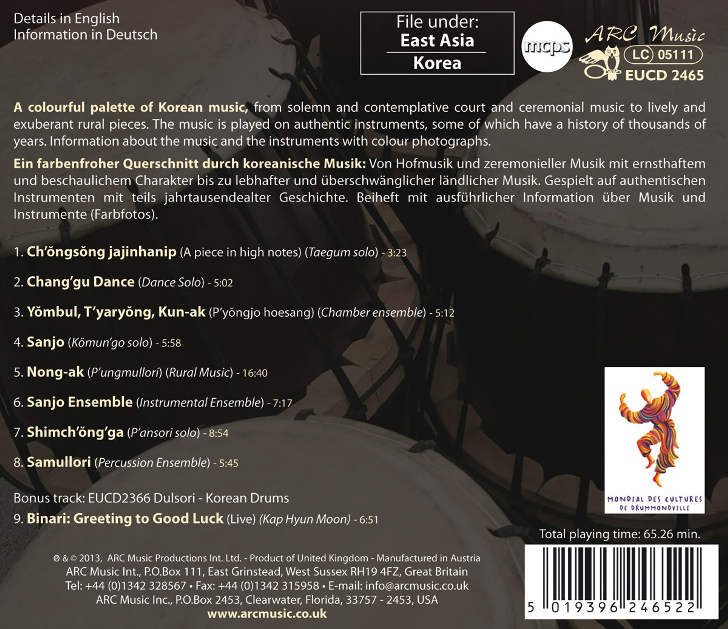 Eine bunte, abwechslungsreiche Palette koreanischer Musik, von feierlicher und besinnlicher Hof- und Zeremonienmusik bis hin zu lebhaften und ausgelassenen ländlichen Stücken. Die Musik wird auf authentischen Instrumenten gespielt, von denen einige eine jahrtausendealte Geschichte haben.