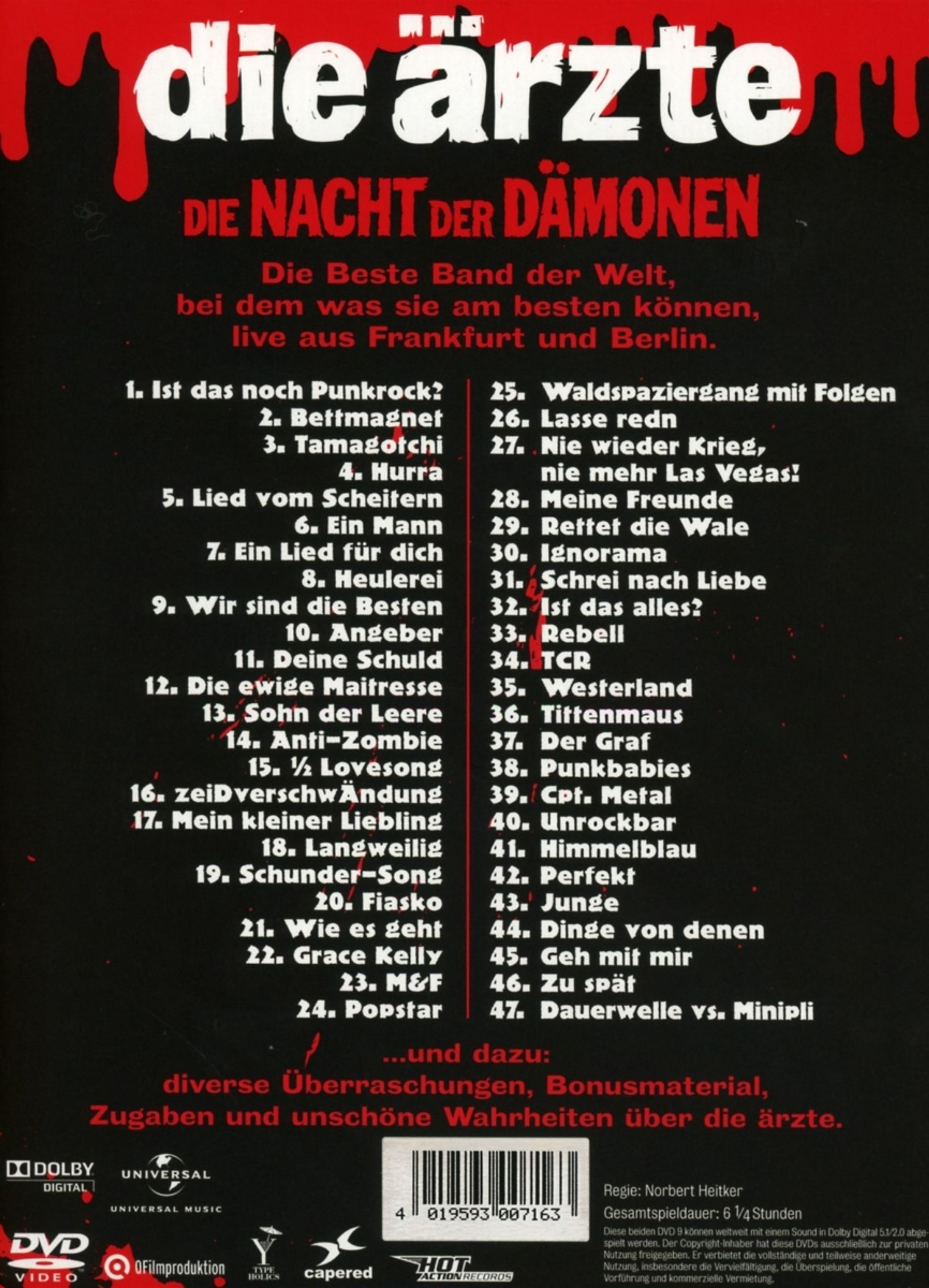 Die Ärzte, sie gehören neben den Toten Hosen zu Deutschlands erfolgreichsten Musikgruppen mit Wurzeln im Punkrock. Auch in diesem Jahr 2013 geht ihre Erfolgswelle weiter. Sie waren bereits 3-fach für den Echo 2013 nominiert und veröffentlichen nun den nächsten Meilenstein in ihrer bisher langen und großartigen Karriere, ihr unglaubliches Live-Dokument - Die Nacht der Dämonen.