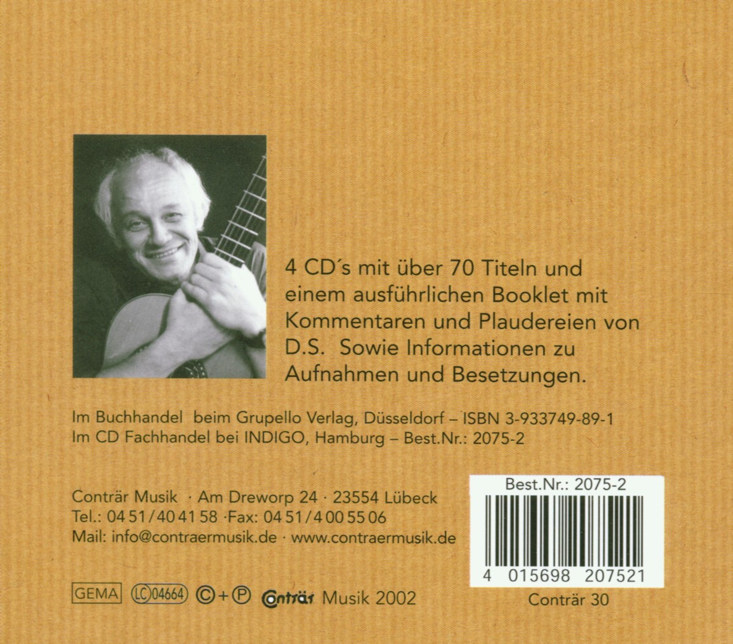 Neben Degenhardt, Wader und Mey gehört Dieter Süverkrüp zu den großen Liedermachern der ersten Stunde. Nach großen Erfolgen in den sechzigern und siebzigern zog er sich aus dem Musikgeschäft zurück und widmete sich wieder seiner Tätigkeit als Graphiker und Autor (u. a.Sendung mit der Maus). Aufgrund der vielen Nachfragen nach den Süverkrüp'schen Klassikern hat Conträr Musik eine liebevoll und aufwendig gestaltete 4 CD-Box mit insgesamt 70 Liedern aus der Feder von Süverkrup zusammengestellt. Darunter befinden sich auch einige bisher unveröffentlichte Versionen und Titel (div. Liveaufnahmen u. a. 65er Waldeck-Festival und eine Duoaufnahme mit H. D. Hüsch). Ein 40 seitiges ausführliches Booklet mit Kommentaren und Plaudereien sowie Informationen zu Aufnahmen, Besetzung komplettieren dieses Liederpaket.