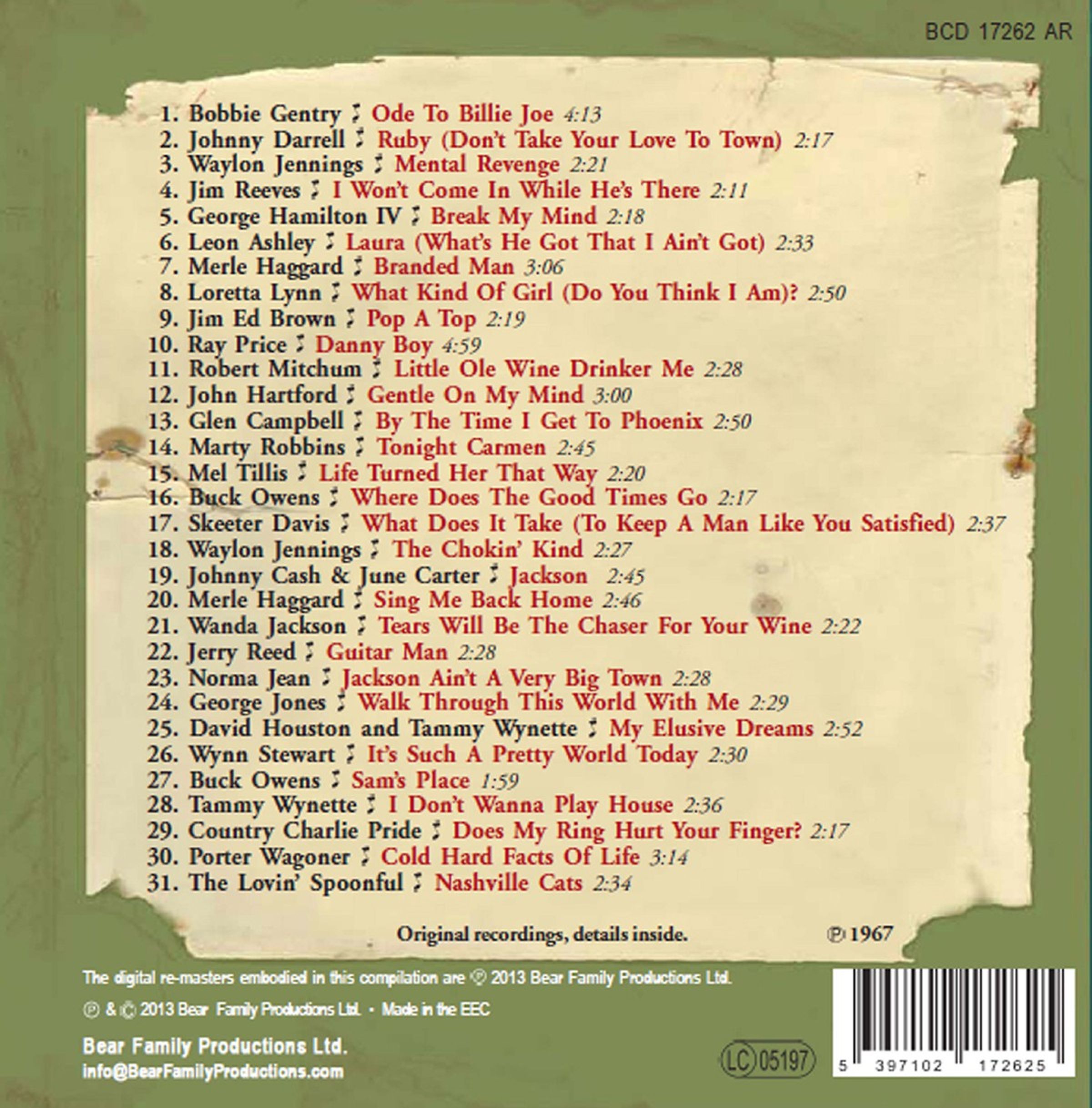 Das neue Paket enthält zu viele Originalfassungen von Hit-Klassikern um sie hier aufzulisten - werfen Sie einen Blick auf die Titelliste! Aber die Serie enthält auch unterbewertete Klassiker und Beinahe-Hits wie Gram Parsons Aufnahmen mit der International Submarine Band und den Byrds, George Jones' oftmals ignoriertes Albumstück Beneath Still Waters (später ein Nummer-Eins-Hit für Emmylou Harris), Charlie Louvins schaurigen Klassiker Will You Visit Me On Sundays, Roger Millers Originalversion von Me And Bobby McGee und Little Green Apples, Jim Alleys ultraseltenes Original von Only Daddy That'll Walk The Line, um nur einige zu nennen! Damit nicht genug!