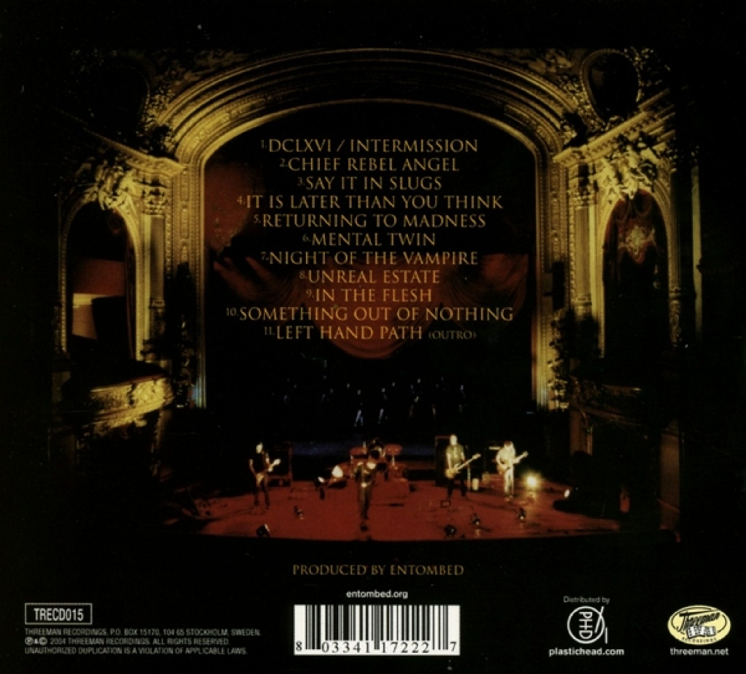 »Das Metalbands mit ganzen Orchestern auftreten ist mittlerweile ja nix Neues mehr. Therion, Dimmu Borgir, Metallica und sogar die Scorpions haben sich daran versucht. Bei den einen handelte es sich dabei um nicht mehr als ein Experiment, bei den anderen gehört es unbedingt mit zur Musik dazu. Einen ganz neuen Weg beschreiten nun jedoch Entombed. Die Death N Roll Könige haben sich nämlich im Rahmen einer im Jahre 2002 stattgefundenen, ›Unreal Estate‹ betitelten Konzertreihe im Royal Opera House zu Stockholm mit dem königlichen Ballett für ein Event der besonderen Art zusammengetan. Ballett? Das macht aber keine Musik! Richtig, und folglich sind auf ›Unreal Estate‹ auch nur Entombed selbst zu vernehmen, allerdings in einer sehr konzentrierten Form, die man von den sonst üblichen Konzerten her nicht unbedingt kennt. Hier wird zwar trotzdem ganz schön gerockt, jedoch immer mit Respekt vor dem altehrwürdigen Gebäude, in dem die Buben auftraten. Somit dürfte ›Unreal Estate‹ wohl kaum als eine der sonst üblichen Live-Performances der Todesblei-Veteranen durchgehen, zumal auch der Sound der Scheibe für eine Live-Aufnahme sehr klar und transparent geraten ist. Auch das Publikum ist nur an einigen wenigen Stellen zu vernehmen. Die Auswahl der Songs konzentriert sich (natürlich) auf die Post-DM-Phase der Band und legt ihren Fokus auf das 2000er Album ›Uprising‹.« (metal.de)Disk 1 von 1 (CD)