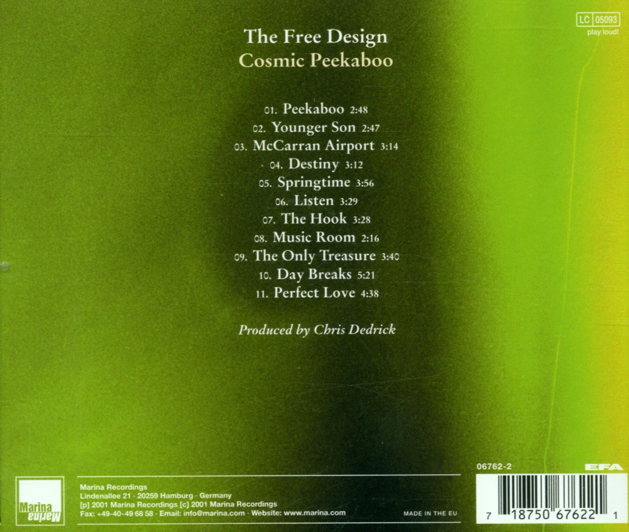 Die Band The Free Design gründete sich 1966 im Folk-Umfeld des New Yorker Greenwich Village und nahm bis 1975 insgesamt sieben Alben auf. Ihr Markenzeichen waren himmlische Vokalharmonien zu samtweichen Melodien, stilistisch angesiedelt irgendwo zwischen Folk, Jazz und der progressiven Popmusik jener Zeit. Anlässlich des Erscheinens des Beach-Boys-Tributalbums „Caroline Now“ im Jahr 2000 taten sich The Free Design wieder zusammen und veröffentlichten ein Jahr später die CD „Cosmic Peekaboo“, die jetzt 2006 erstmalig als Vinyl veröffentlicht wird. „Cosmic Peekaboo“ war CD des Monats im Stereoplay („Zwölf makellose Harmony-Pop-Perlen“), und der Rolling Stone schwärmte von „Musik von einem anderen Stern“.