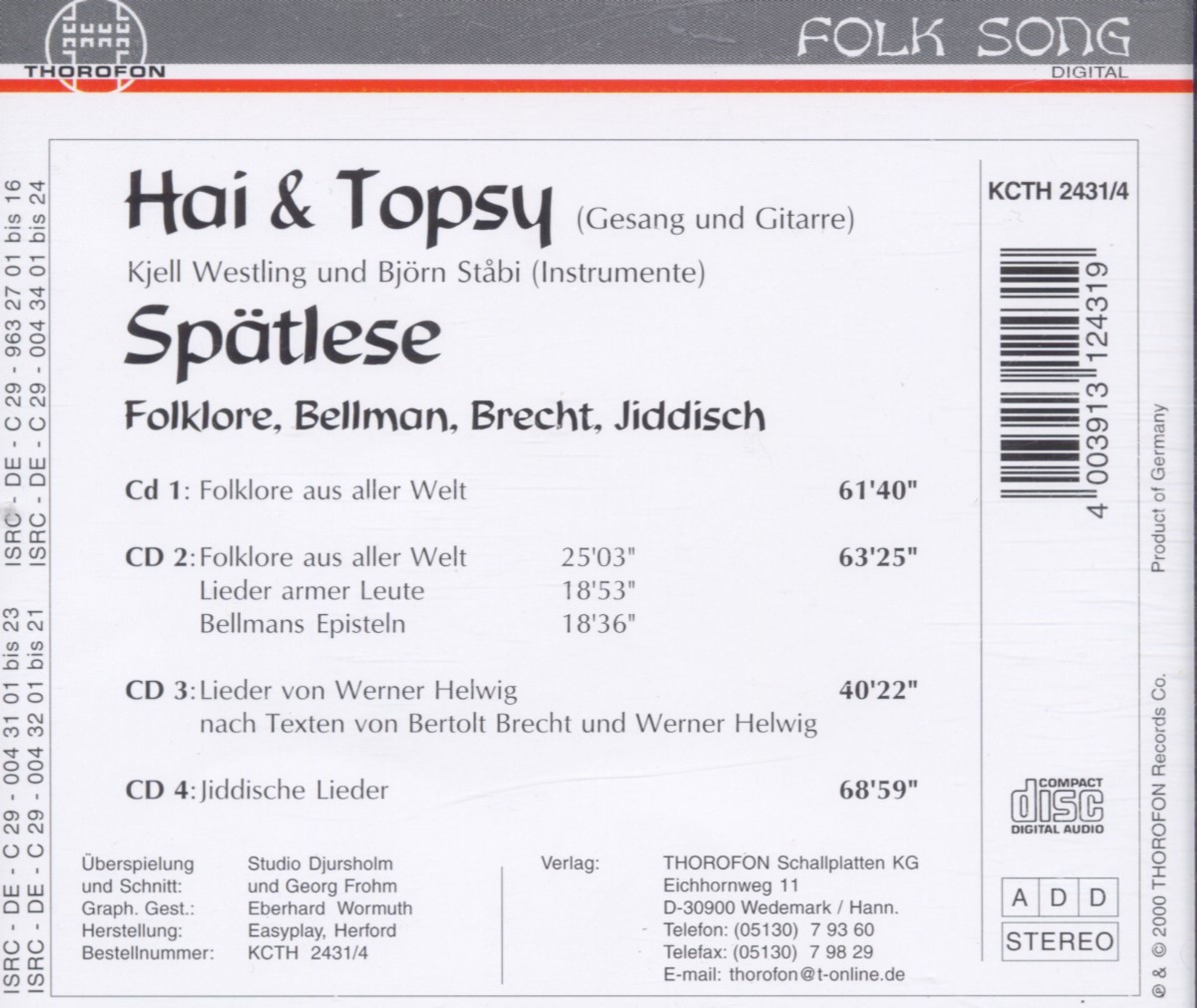 Hai & Topsy: Spätlese - Folklore, Bellmann, Brecht, Jiddisch auf 4 CDs