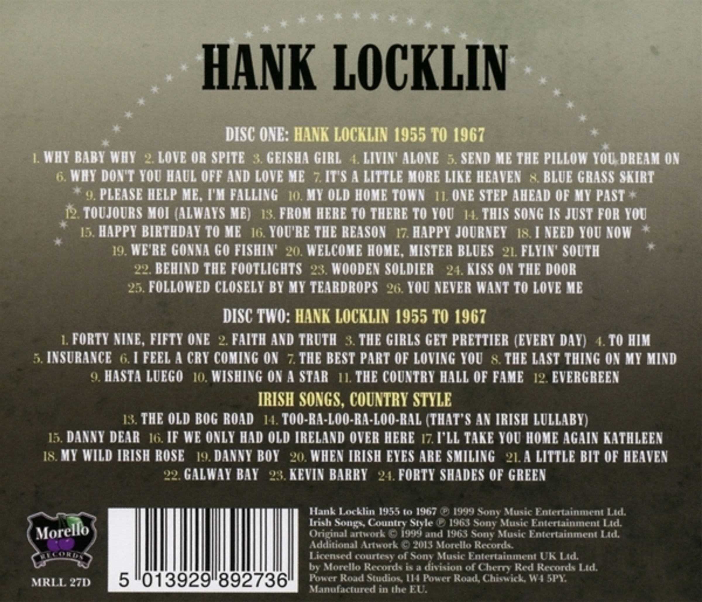 Hank Locklin war ein US-amerikanischer Country-Sänger. Die hier vorliegende Wiederveröffentlichung vereint seine beiden Alben "1955 To 1967" und "Irish Songs, Country Style" auf einer Doppel-CD.