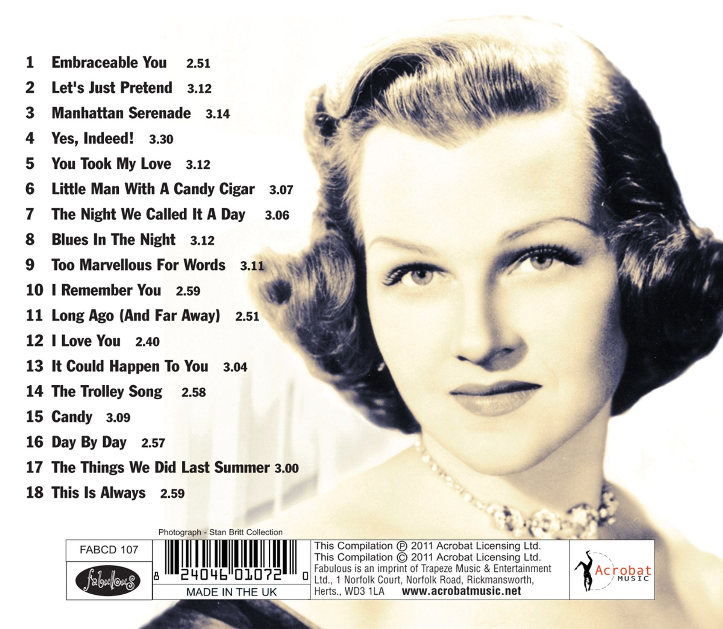 Throughout the 1940’s Jo Stafford was one of American popular music’s biggest stars. She began her career as a member of The Pied Pipers vocal group and performed with the Big Band of Tommy Dorsey before striking out as a solo star. This compilation features examples of all these career steps and includes several of her biggest hits.